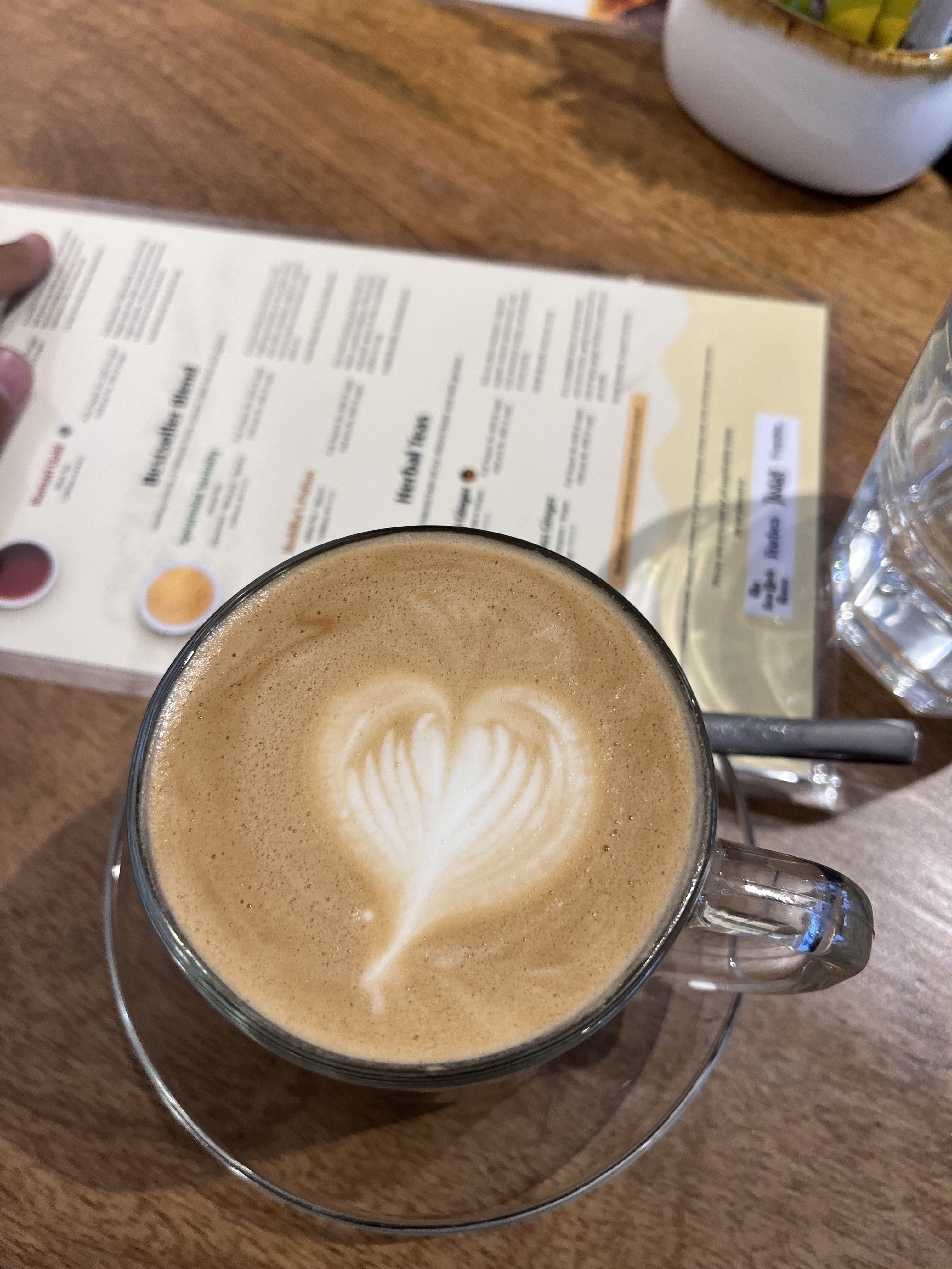 Alternative Text: Closeup of the top of a cup of coffee. There’s foam on top with the shape of a heart on it. In the background, out of focus, are a menu, glass, and other table top things.