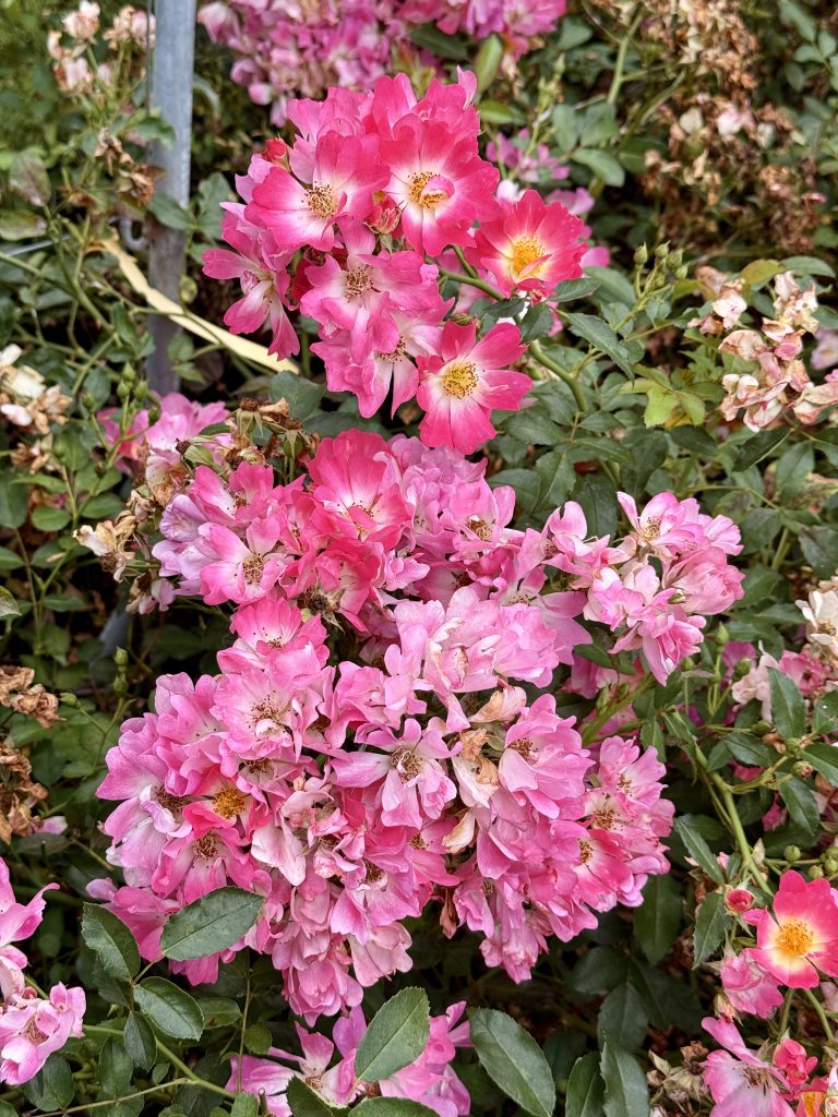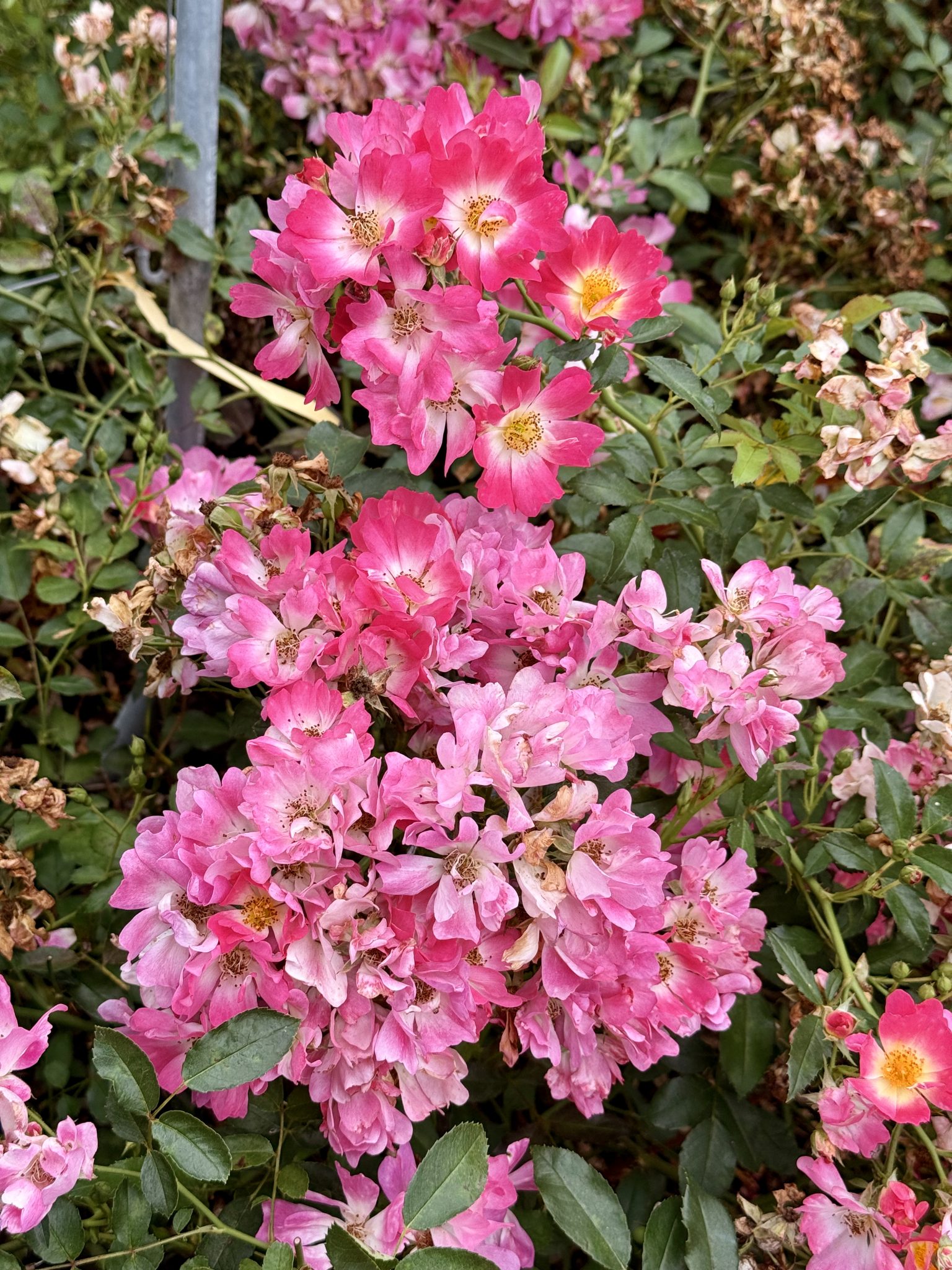 Alternative Text: A dense cluster of miniature, vibrant pink roses in full bloom, surrounded by dark green leaves and a few drying petals. Captured at the International Rose Test Garden, Portland, in the evening.