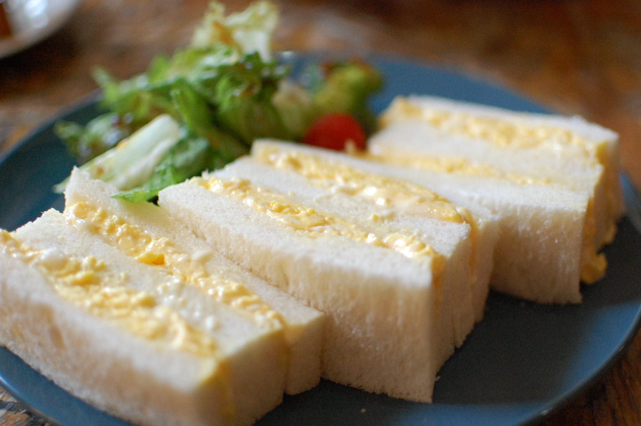 Alternative Text: Egg sandwich served on soft white bread, filled with creamy yellow egg mixture, paired with a fresh side salad of leafy greens and a cherry tomato