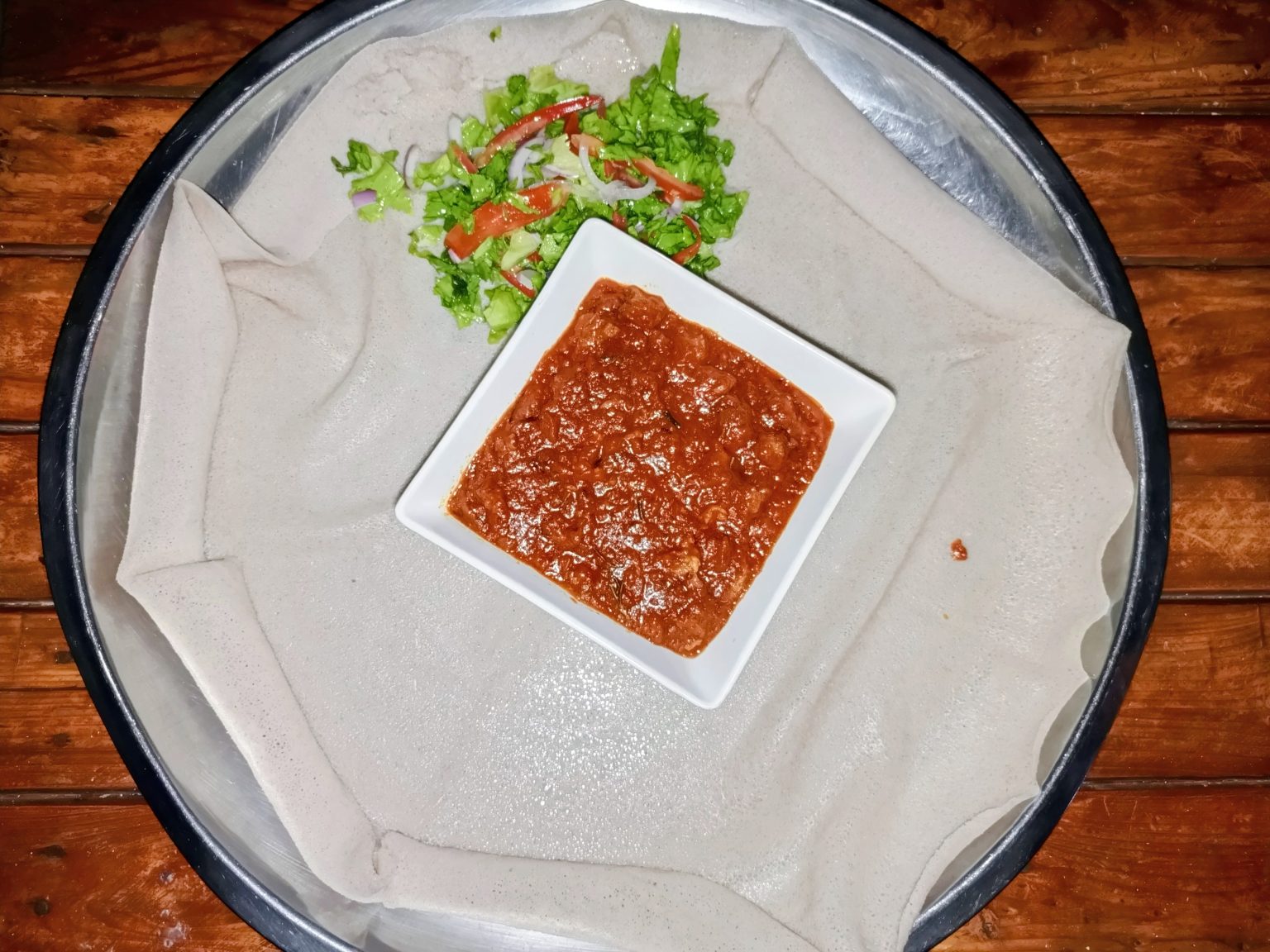 Alternative Text: Top-down view of a traditional Eritrean meal with spicy red tibsi in the center, served on injera with a fresh salad on the side.