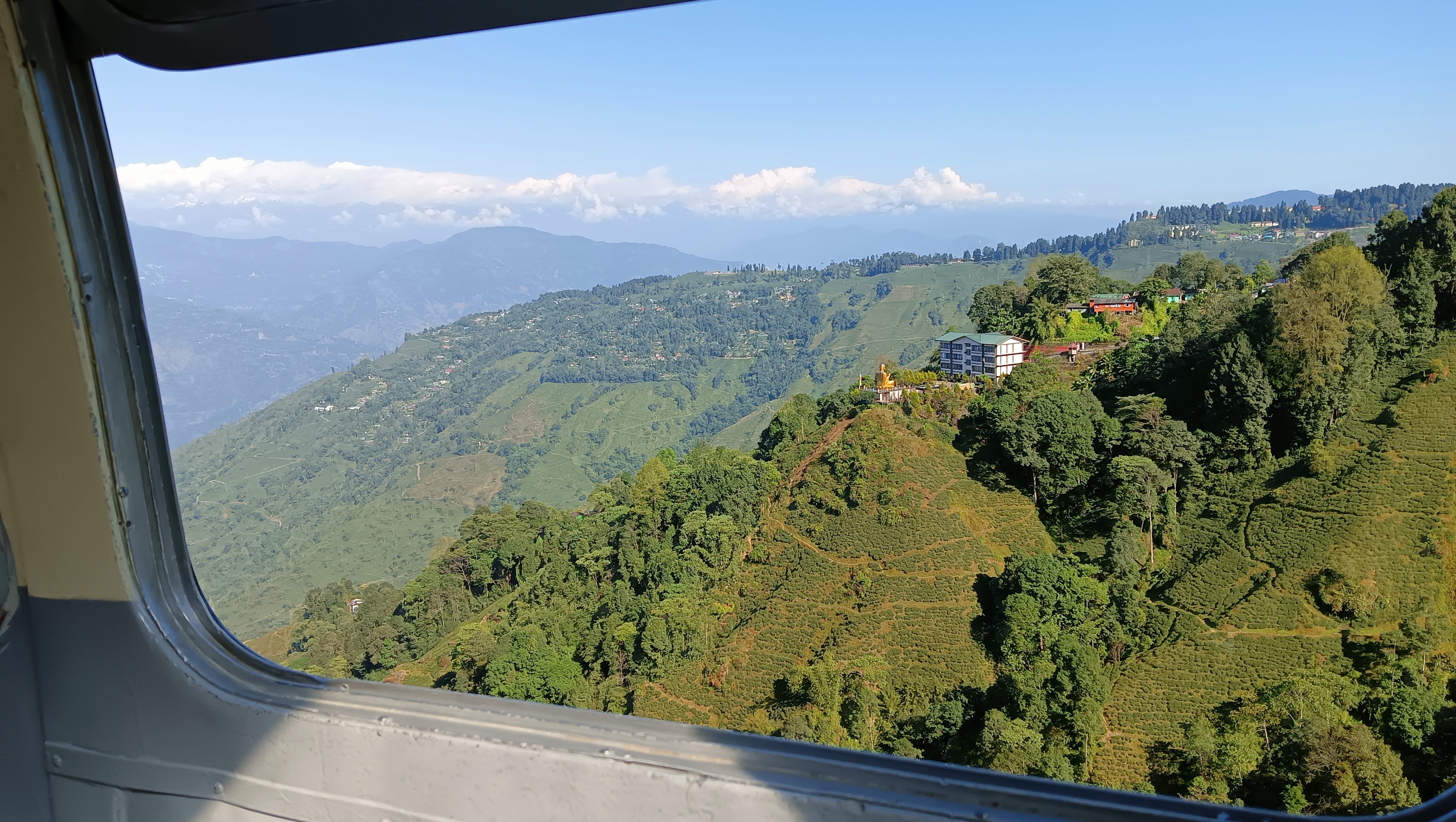 Alternative Text: A view from the window of a plane shows lush green hillsides with terraced fields and scattered houses. In the background, there are distant mountains under a clear blue sky with some clouds.