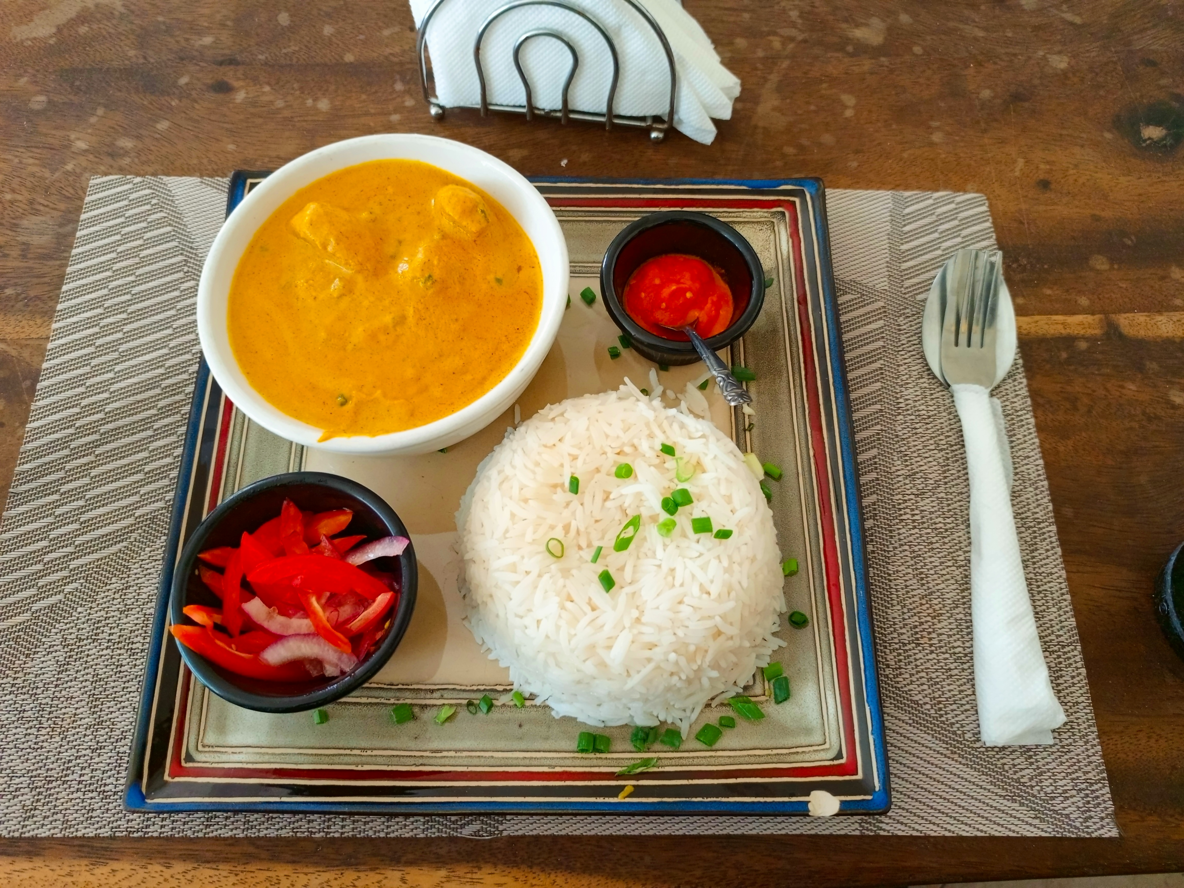 Alternative Text: A plated meal with creamy butter chicken in a white bowl, served with steamed white rice topped with green onions. It includes two sides: onion-tomato salad and red chili sauce, served on a square plate over a wooden table.