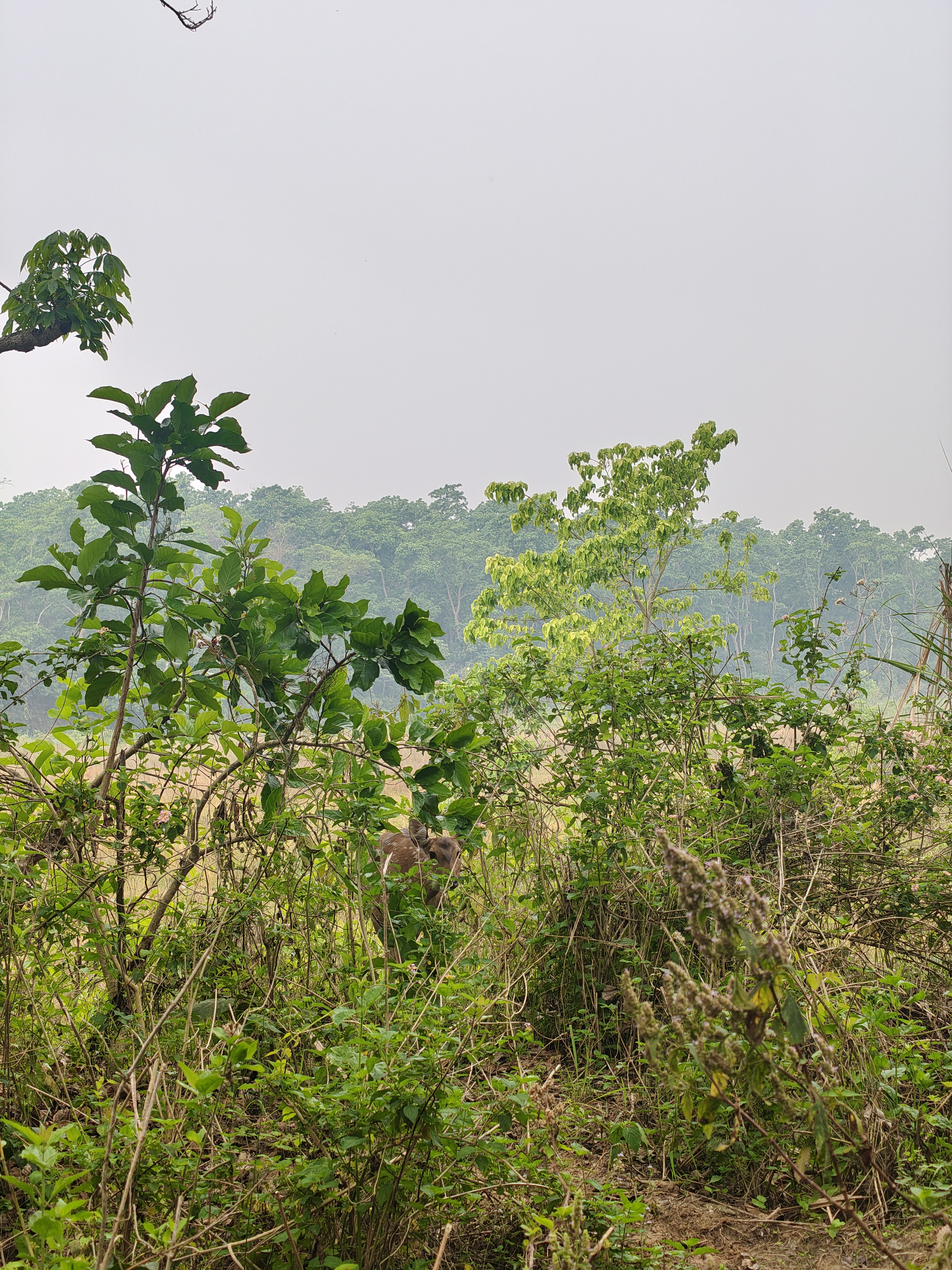 Alternative Text: A dense green area with bushes and trees in a misty setting. A deer is partially hidden among the vegetation.