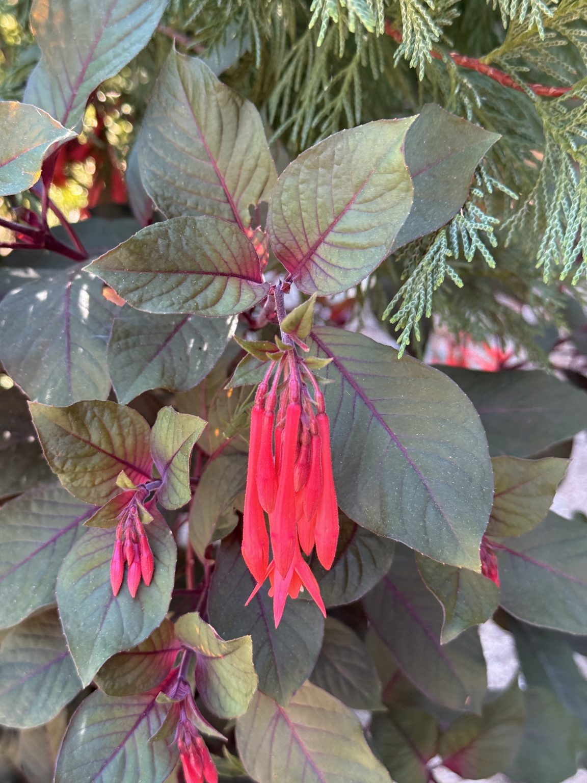 Alternative Text: Bright red, tubular flowers hang down from a plant with dark green, purple-veined leaves. Captured under soft light at the Oregon Zoo, Portland.