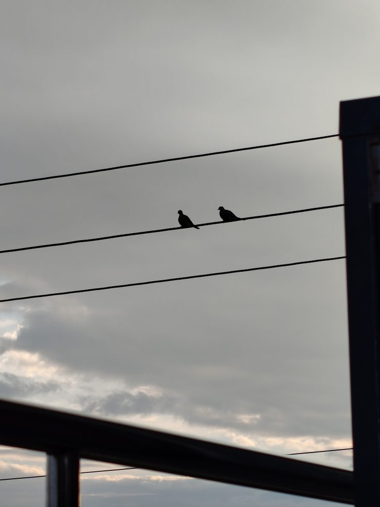 Alternative Text: Two mourning doves sitting on some wires, silhouetted against a cloudy sky.
