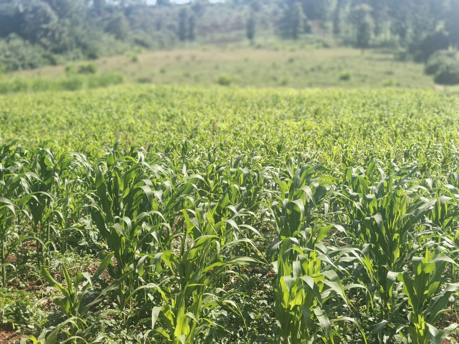 Alternative Text: Young maize plants growing in a healthy green field in rural Kenya.