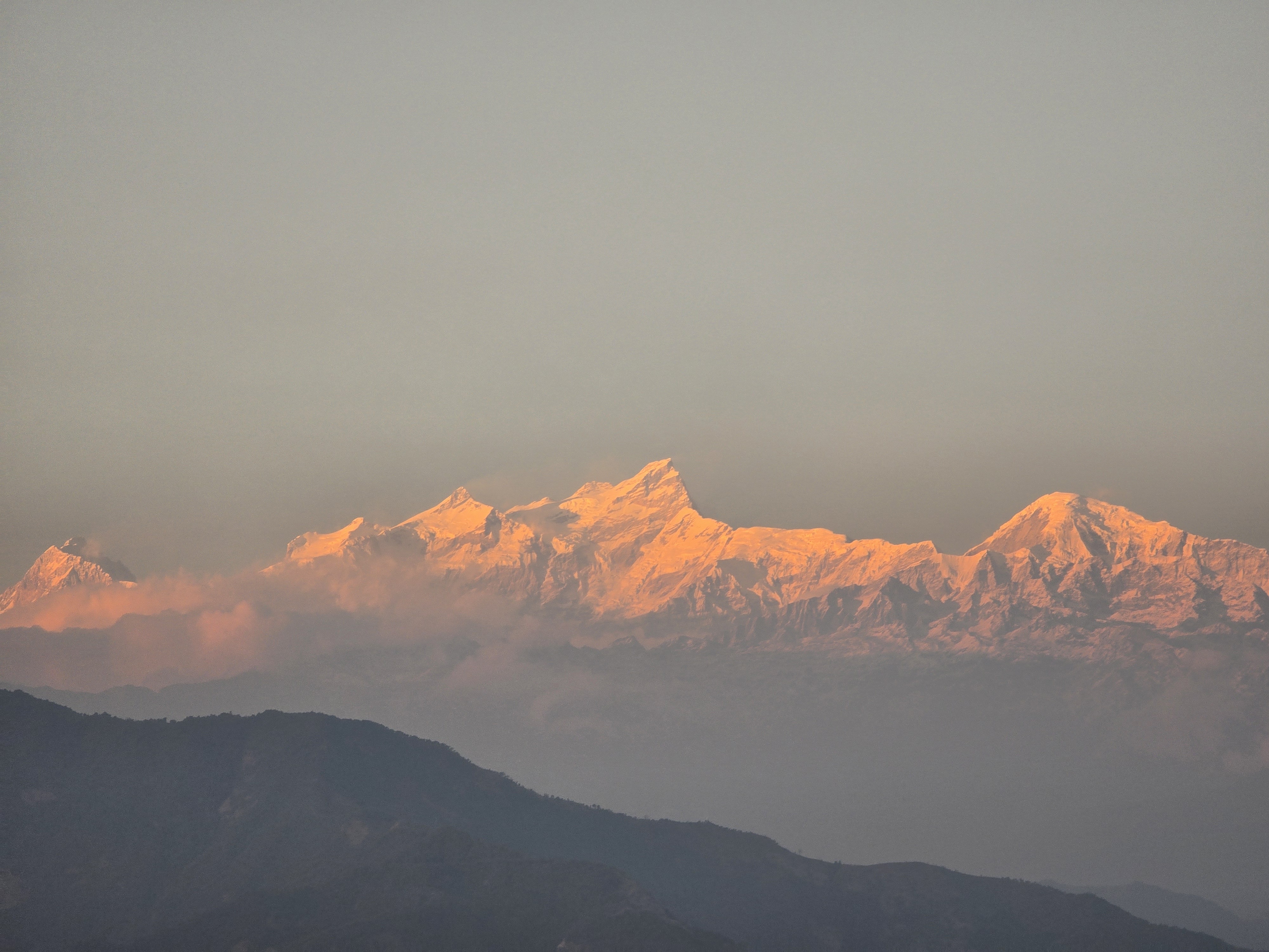 Alternative Text: Snow-capped mountains bathed in a warm golden light at sunrise, with a soft mist in the foreground and rolling hills in silhouette below.