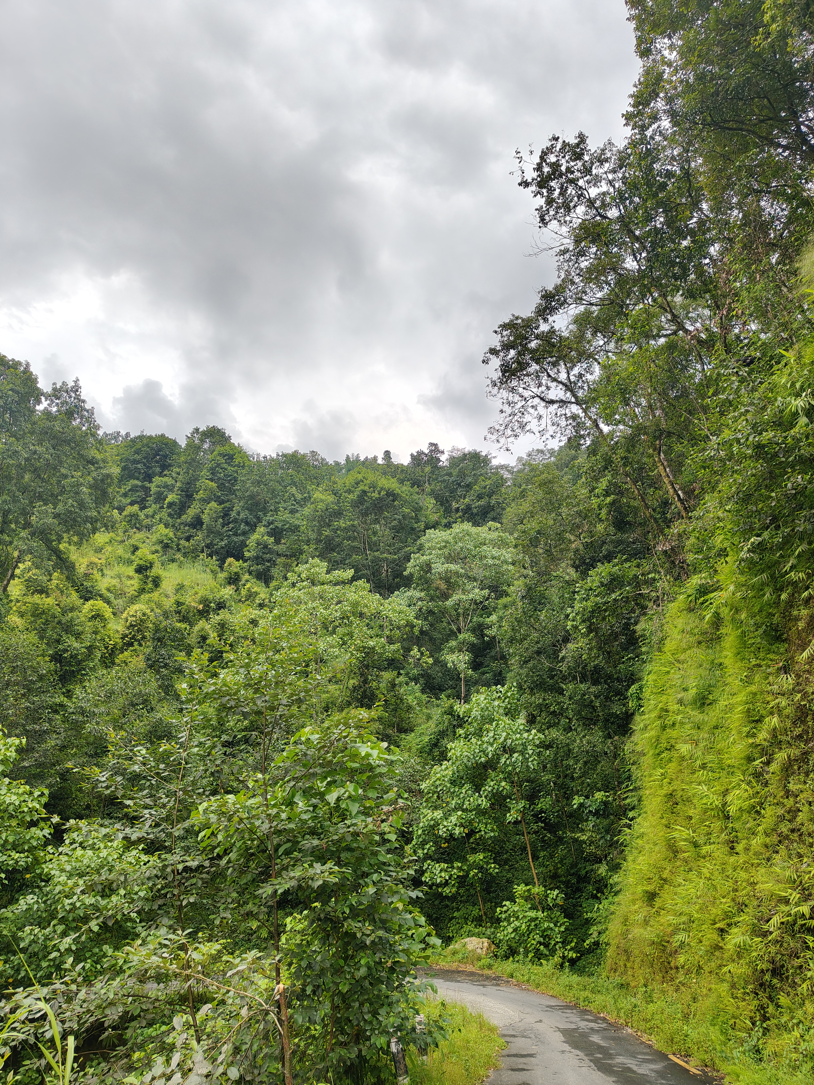 Alternative Text: A winding road leads through a dense forest filled with various shades of green foliage.
