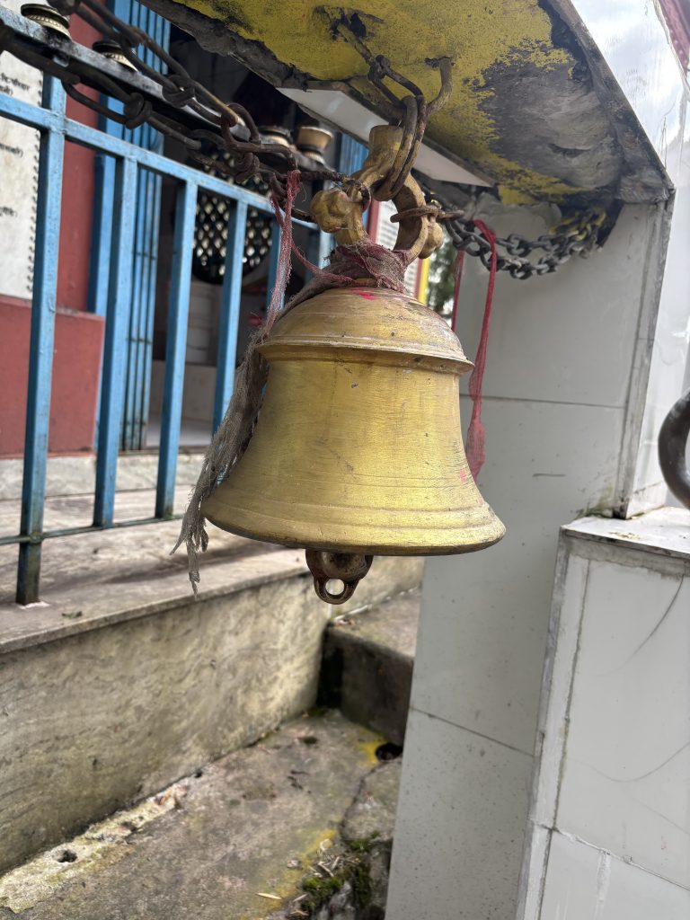 Alternative Text: A weathered golden bell hangs from a chain, showing signs of age with some paint chipping and dirt accumulation