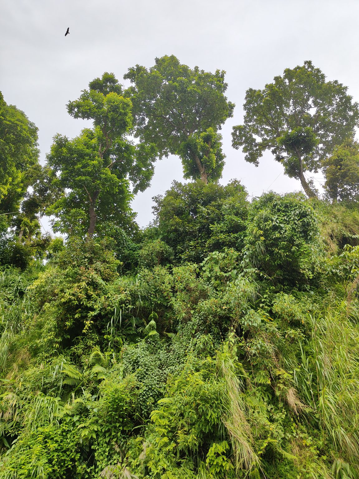 Alternative Text: A dense thicket of greenery, featuring several tall trees with lush foliage.