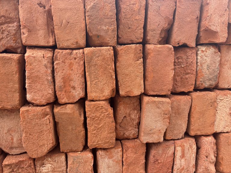 Alternative Text: A close-up view of a stack of red bricks, showcasing the textured surfaces and various shades of orange and red.