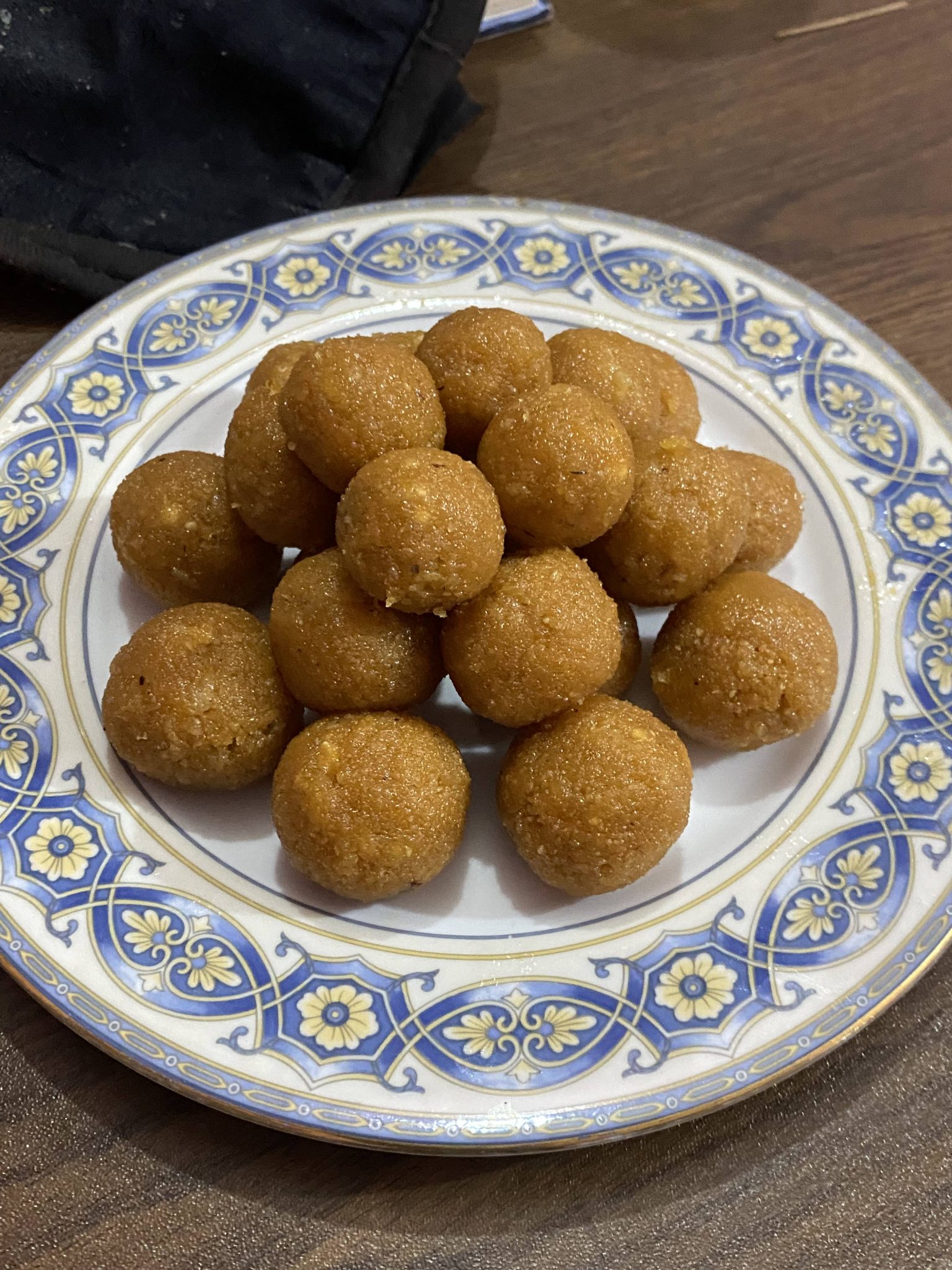 Alternative Text: A plate of golden-brown sweet naru treats is neatly arranged on a decorative blue and white dish, resting on a wooden table. The mood is inviting and warm.