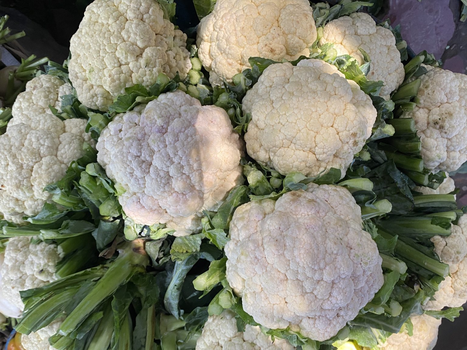 Alternative Text: Fresh cauliflower heads with vibrant green leaves, glowing in sunlight and conveying freshness.