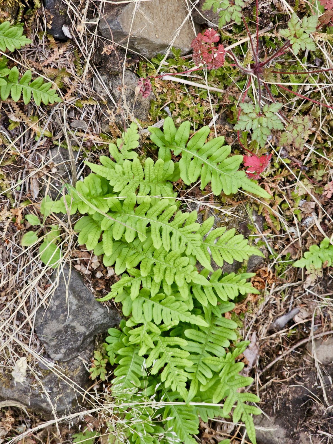 Alternative Text: Bright green ferns grow between rocks and dry grass along a hillside path in the Columbia River Gorge National Scenic Area, Oregon.