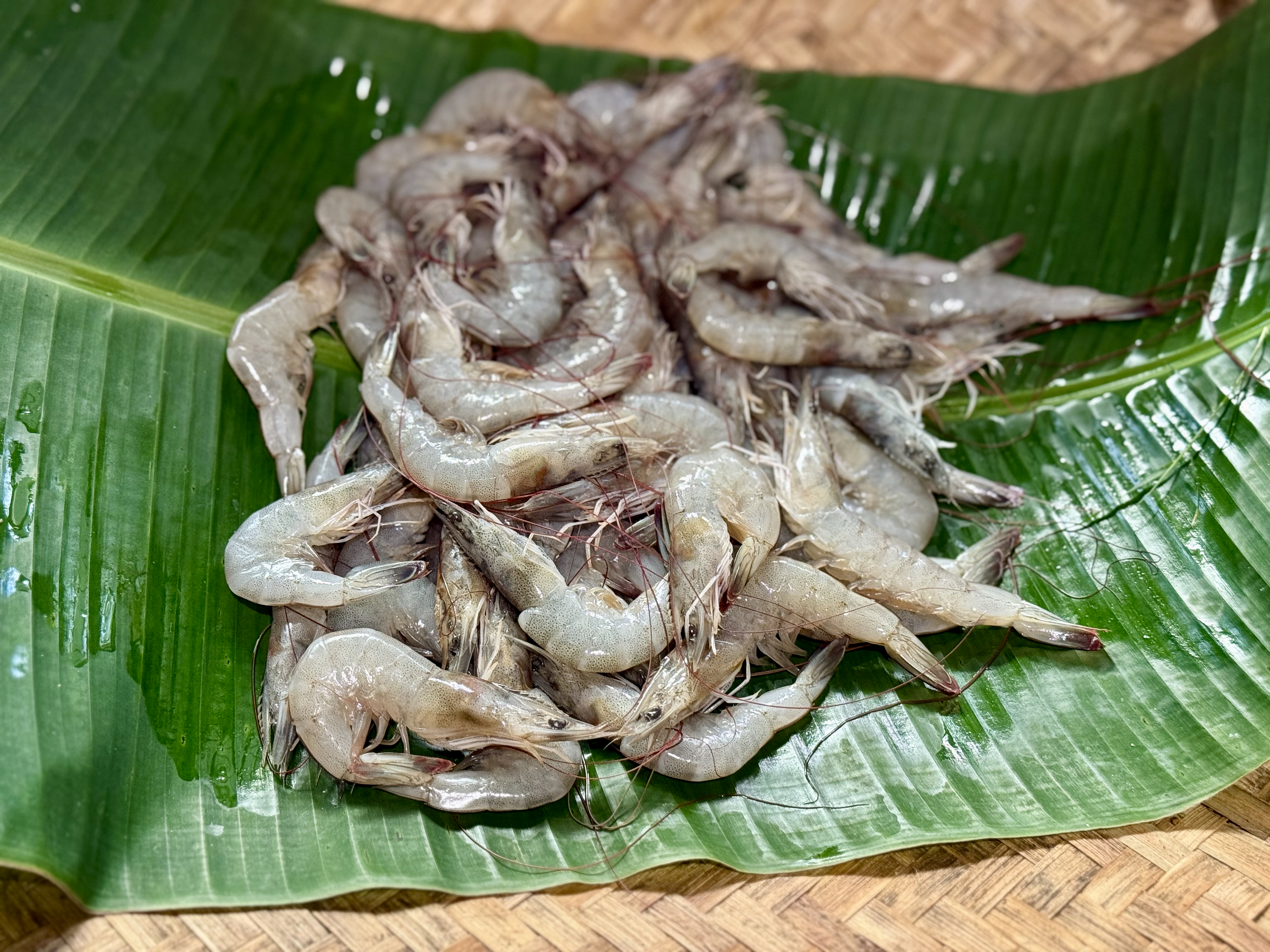 Alternative Text: Fresh raw prawns are neatly placed on a green banana leaf in Perumanna, Kozhikode, highlighting local seafood and traditional food preparation.