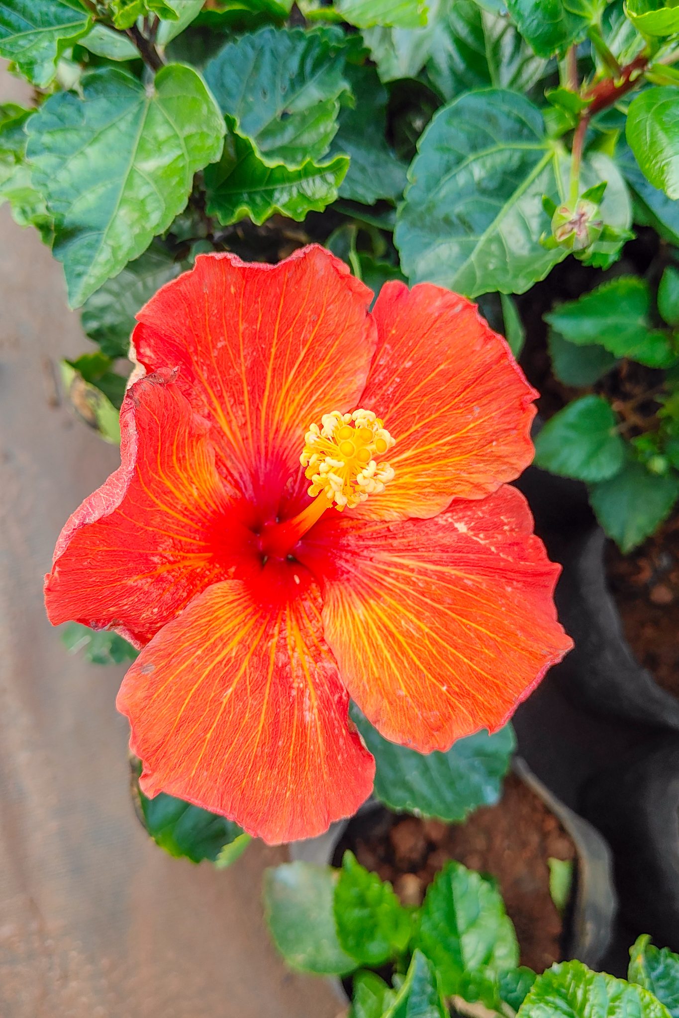 Alternative Text: A vibrant, large hibiscus flower dominates the center of the image, showcasing brilliant shades of red and orange.