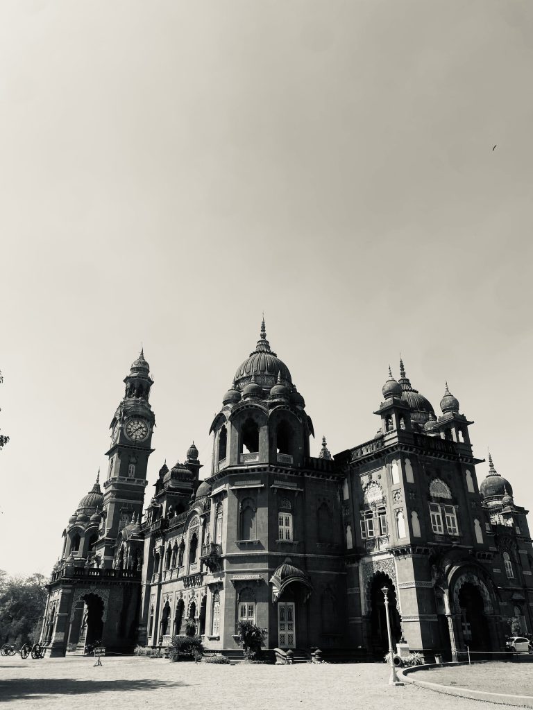 Alternative Text: The monochromatic photo showcases the grand, ornate Indo-Saracenic architecture of the New Palace in Kolhapur, Maharashtra. The building features multiple domes, arches, and a prominent clock tower on the left. Its intricate details are highlighted by the stark black and white tones, set against a bright, clear sky.