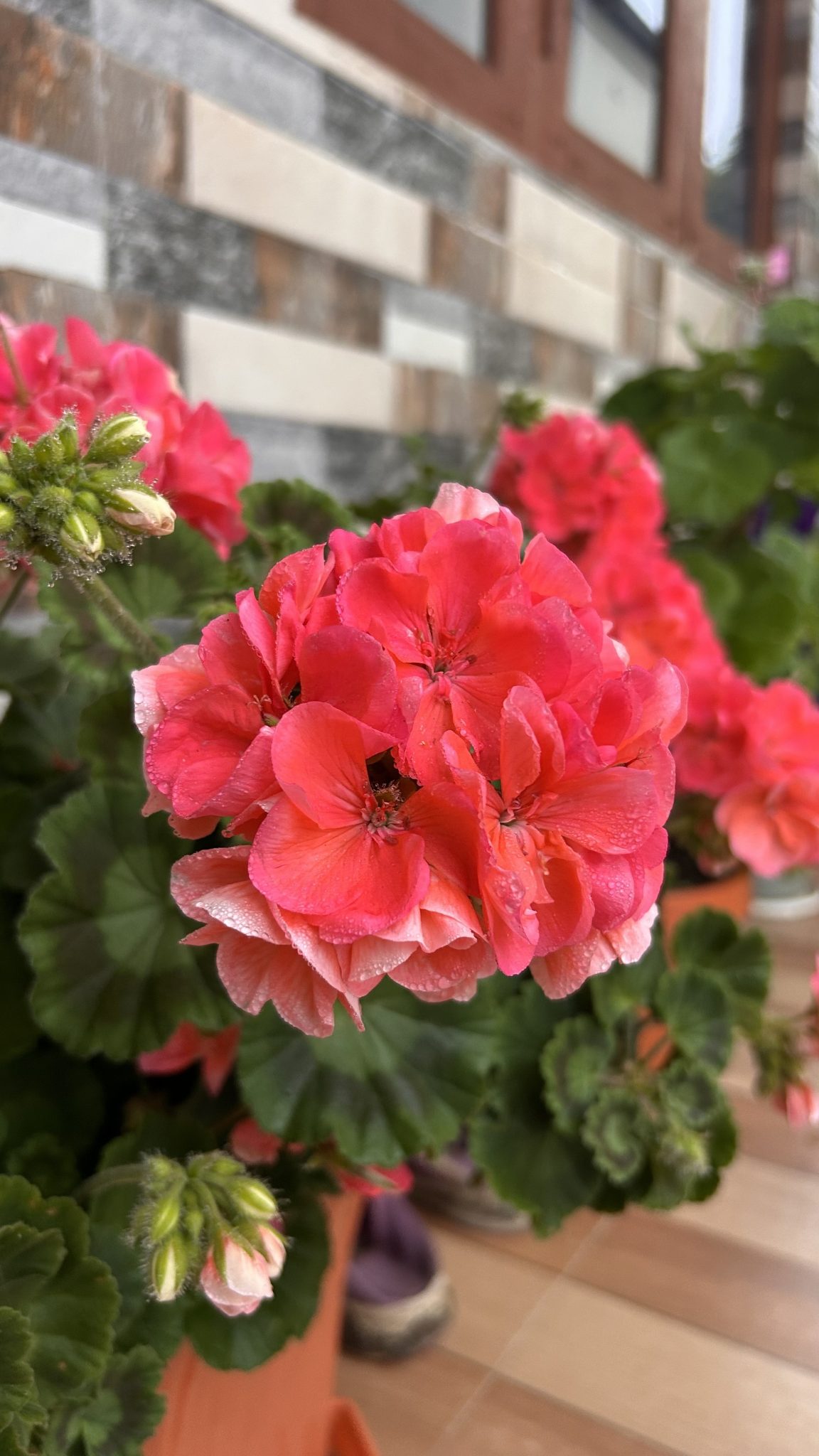 Alternative Text: A close-up photograph of a bright pink geranium flower with multiple layers of petals, set against a blurred background of additional geraniums and a patterned wall.