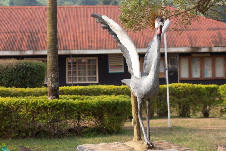 Alternative Text: A decorative sculpture of a crane stands in a garden area, with vibrant greenery and neatly trimmed bushes surrounding it.