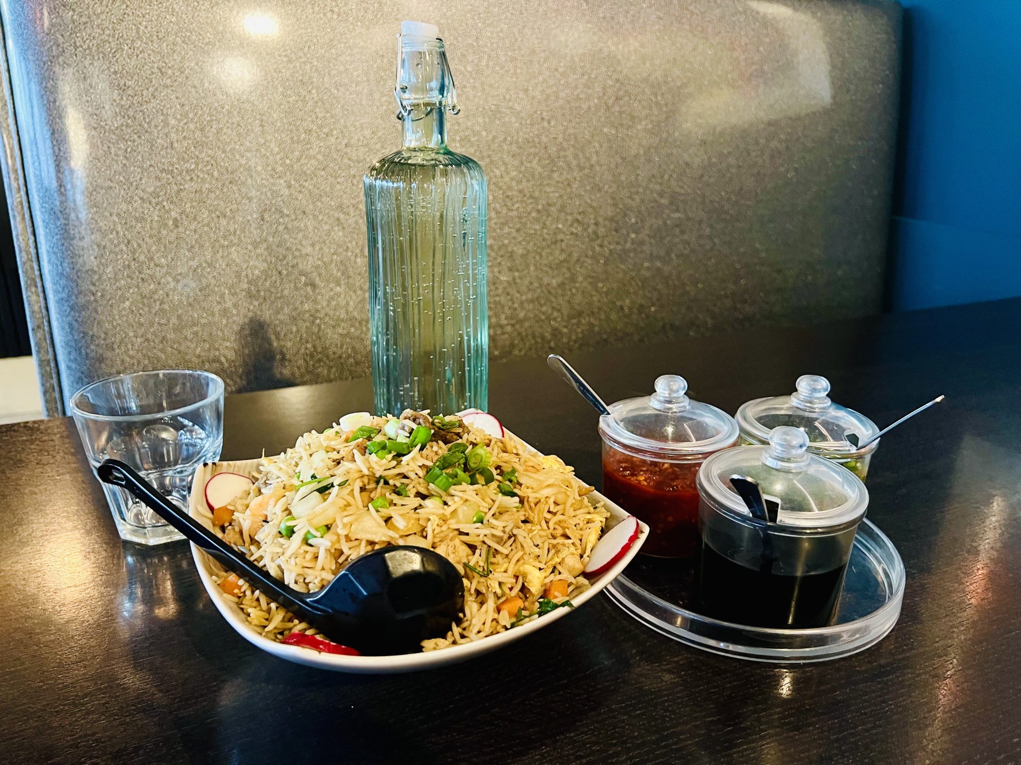 Alternative Text: A plate of fried rice garnished with green onions, accompanied by a black spoon, sits on a dark wooden table.