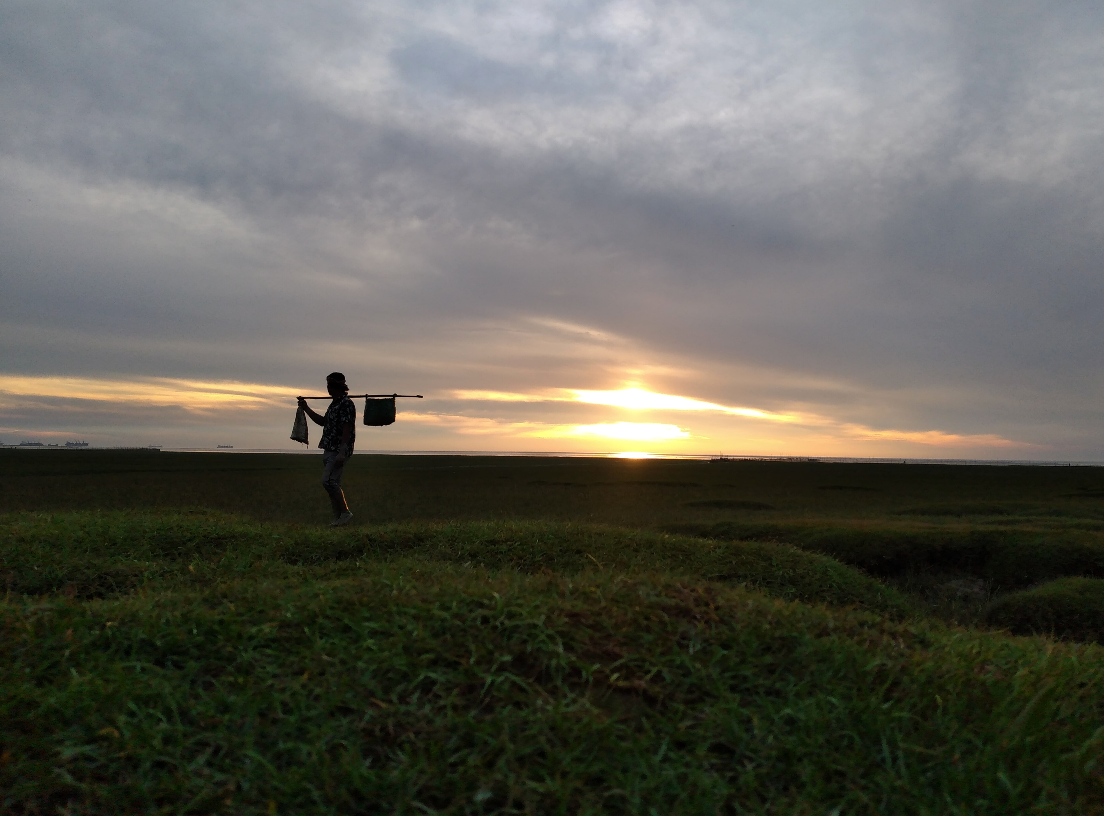 Alternative Text: A silhouette of a person walking across a grassy landscape during sunset, holding a stick over their shoulder with bags hanging from it.