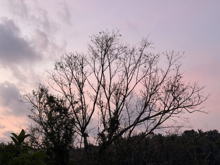 Alternative Text: A bare tree stands tall against a purple-pink sunset sky, with scattered clouds and distant forest. Captured at Cherupa, Kozhikode, Kerala.