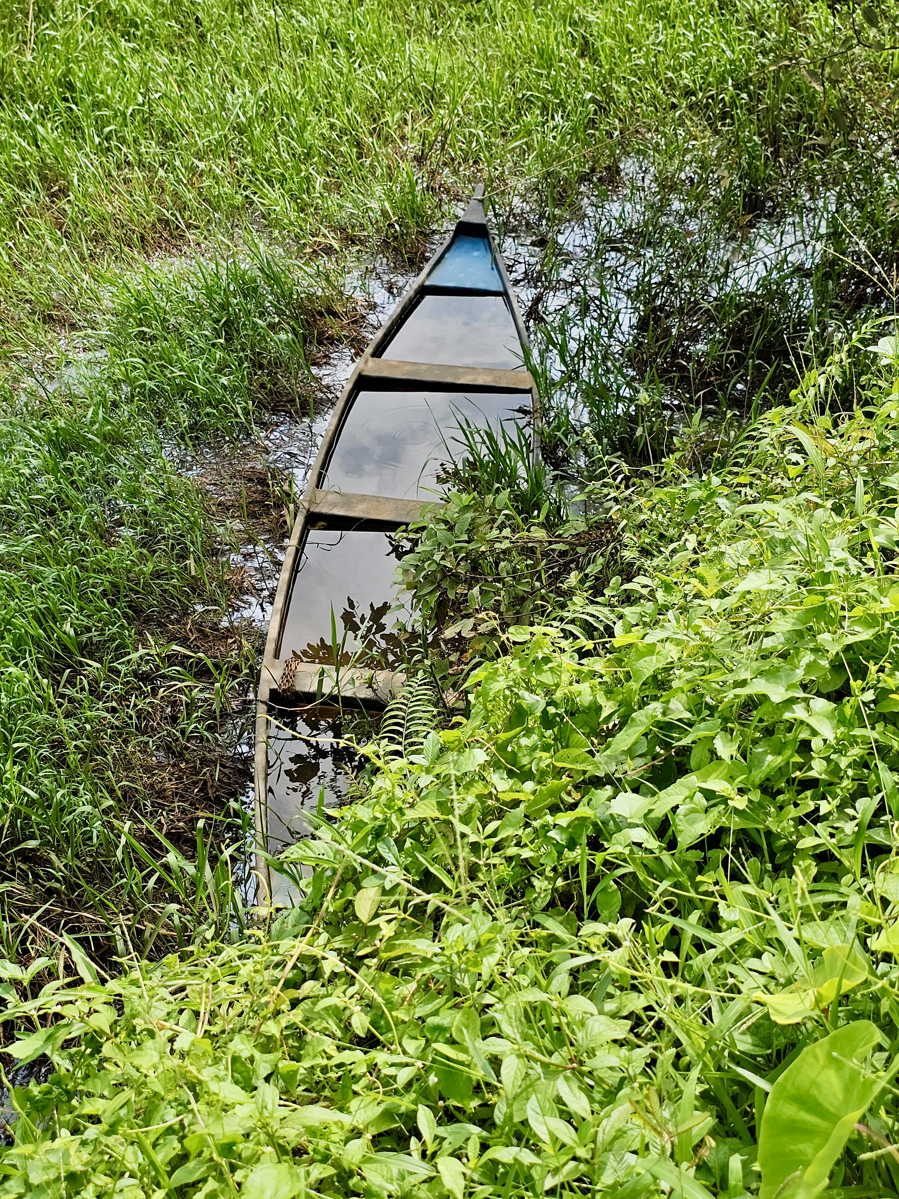 Alternative Text: A lonely boat rests in swampy grass, filled with still water and silent memories. Captured in Ayamkulam, Mavoor, Kozhikode.