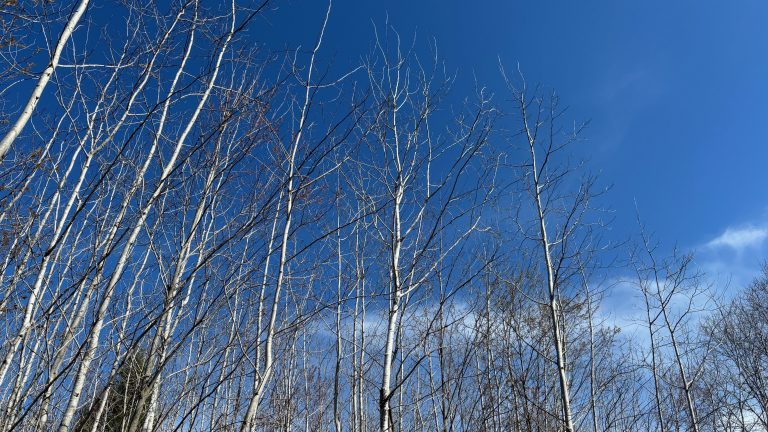 Alternative Text: The tops of young poplar trees set against a blue sky. They have bare branches in the early spring.