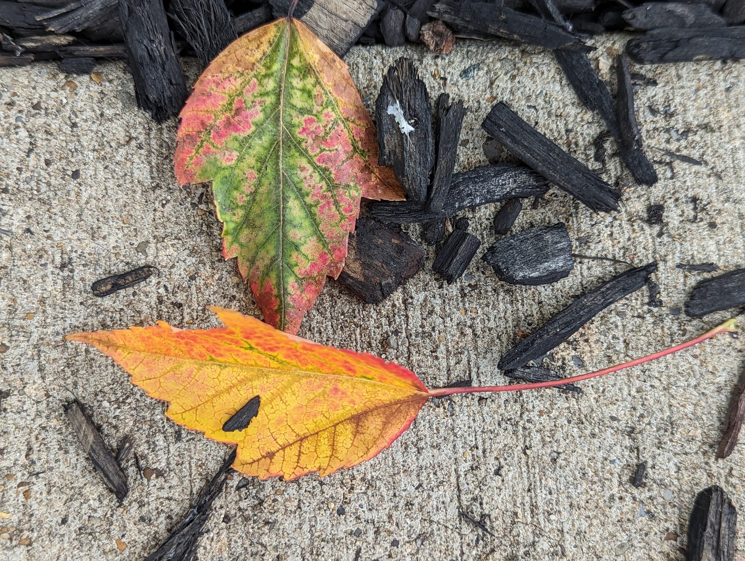 Alternative Text: Two yellowing leafs and some mulch on concrete.