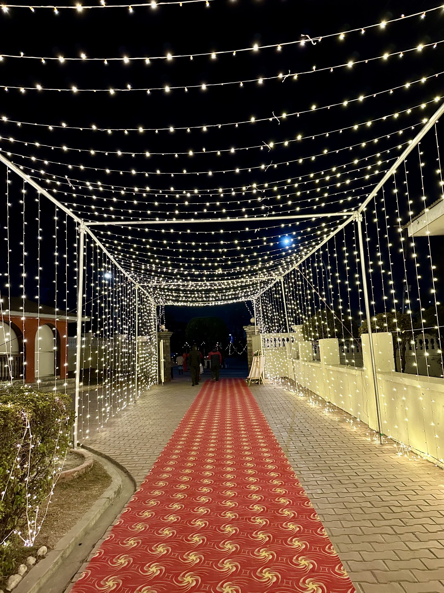 Alternative Text: Strings of lights hanging up the sky lighting the red carpet pathway at some wedding reception entrance!