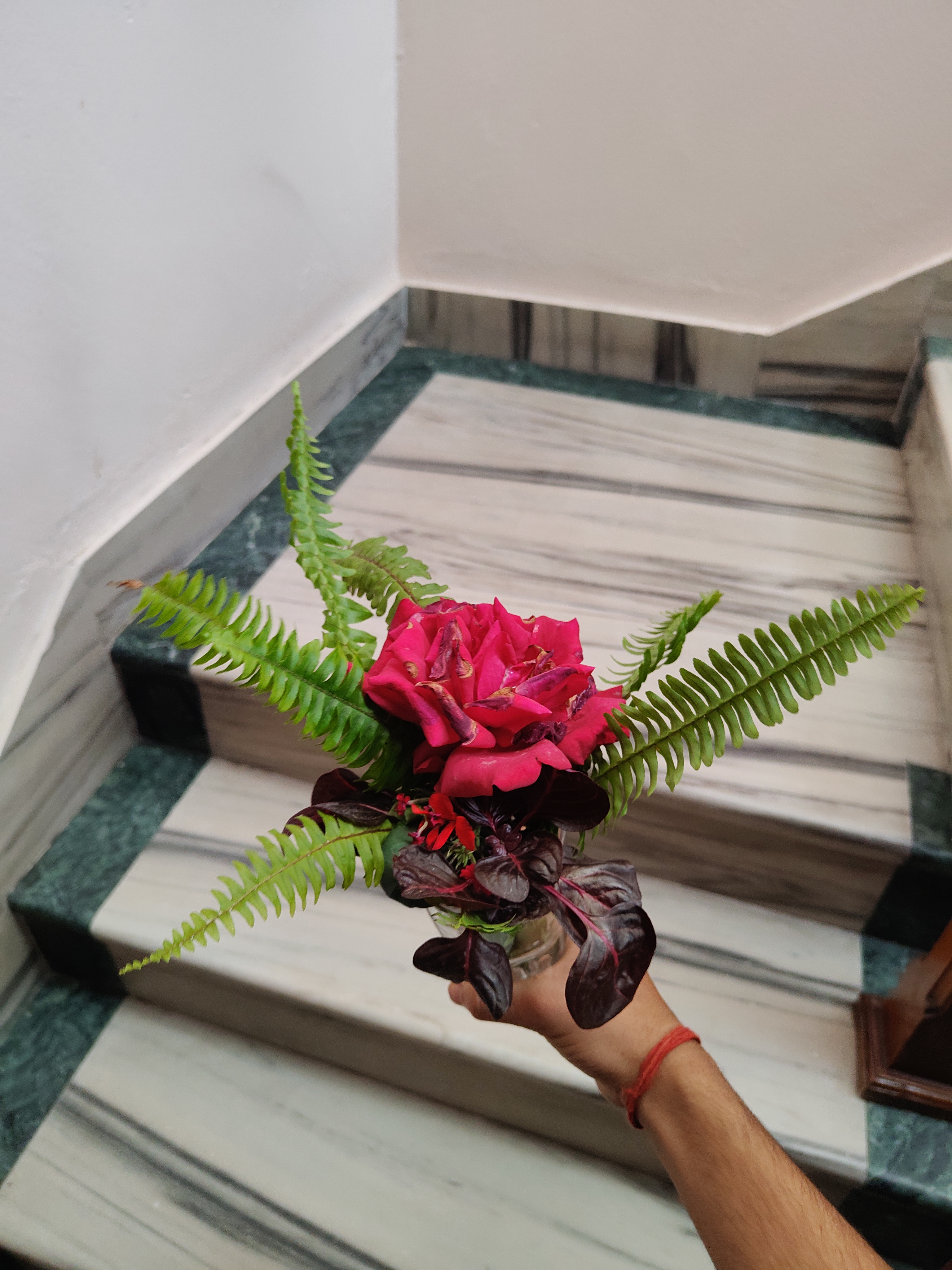 Alternative Text: A person’s hand holds a small bouquet featuring vibrant pink roses and lush green ferns.