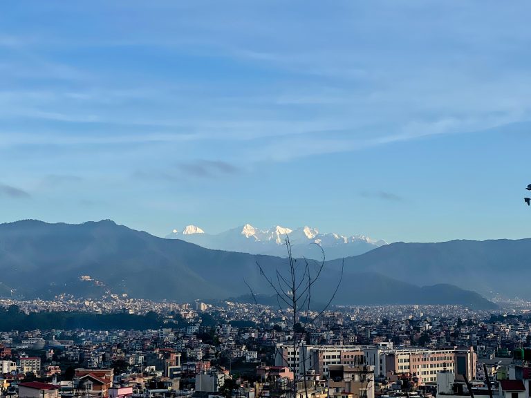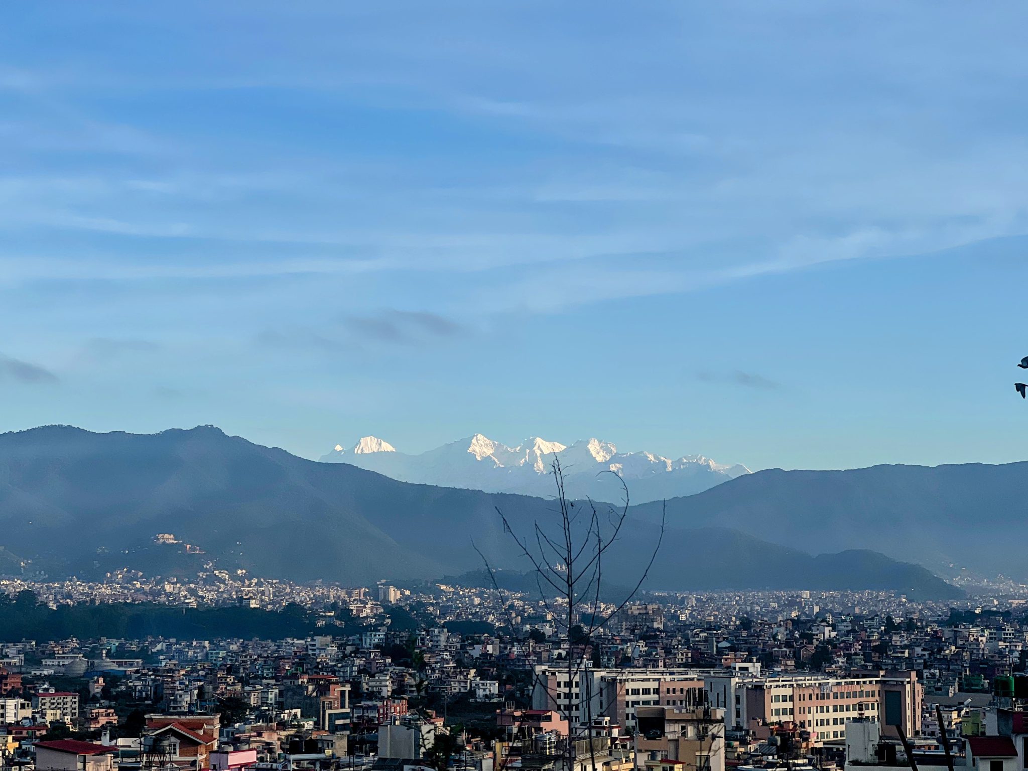 Alternative Text: A wide cityscape view showing a dense urban area in the foreground and snow-capped mountains rising in the distance under a clear blue sky.