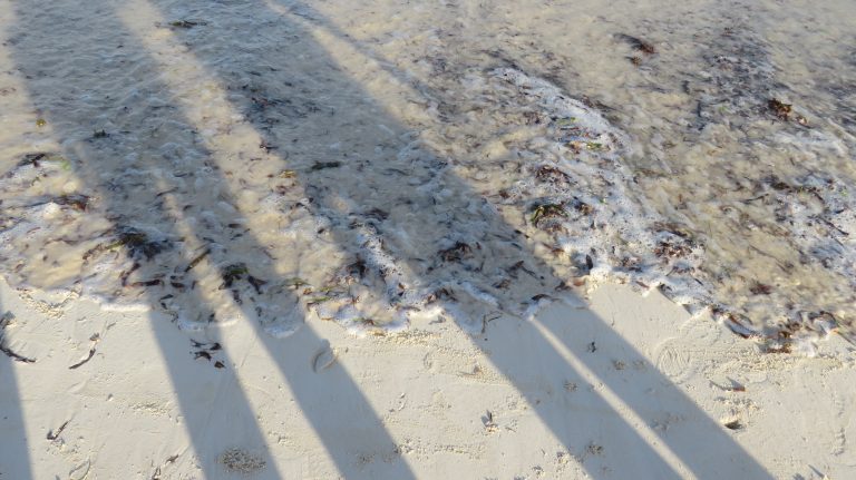 Alternative Text: Two long shadows of people stretch across a white sandy beach as gentle waves and scattered seaweed create patterns along the shore.