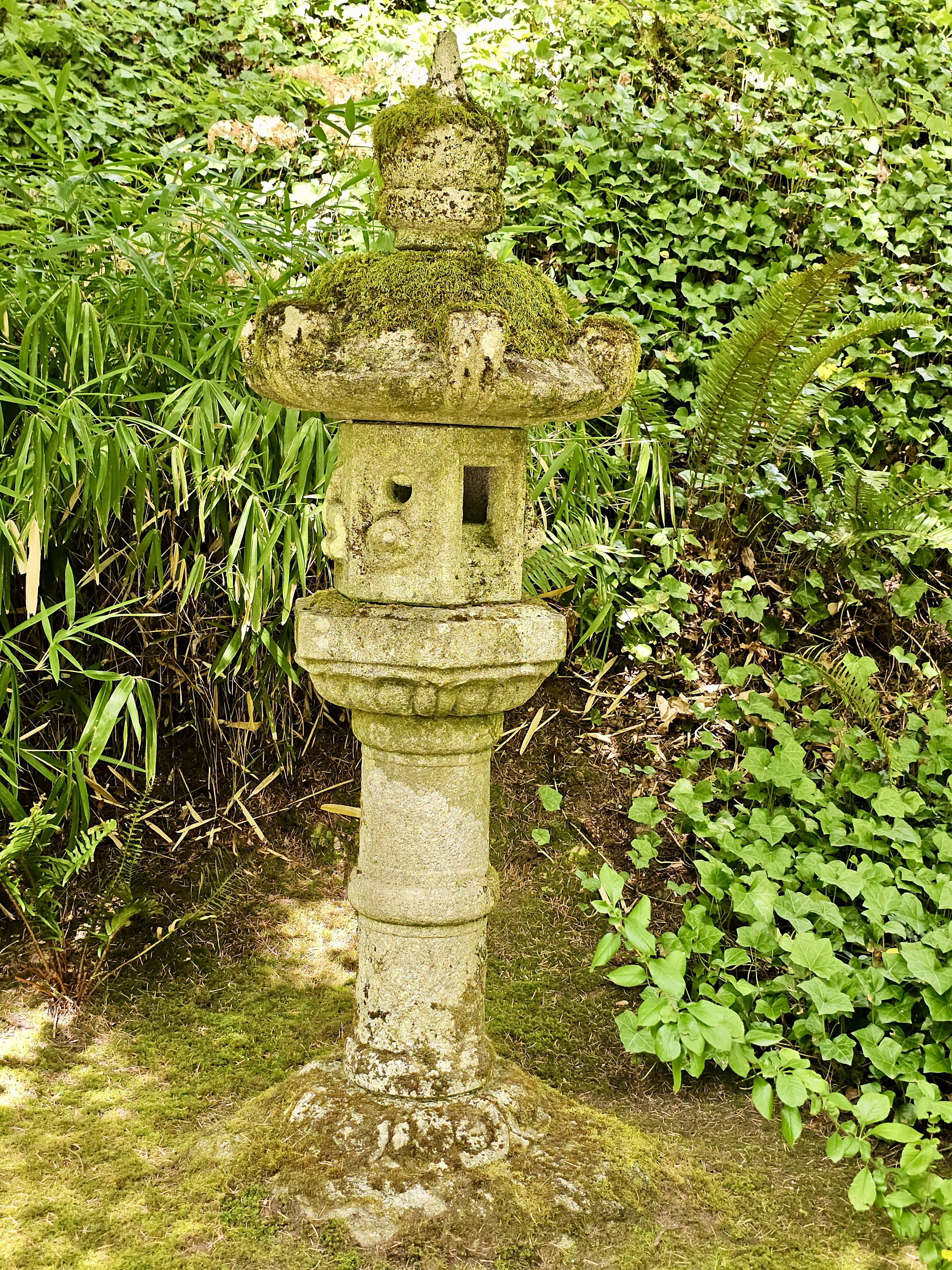 Alternative Text: A traditional Japanese stone lantern covered in moss, standing peacefully among green plants in Portland Japanese Garden.