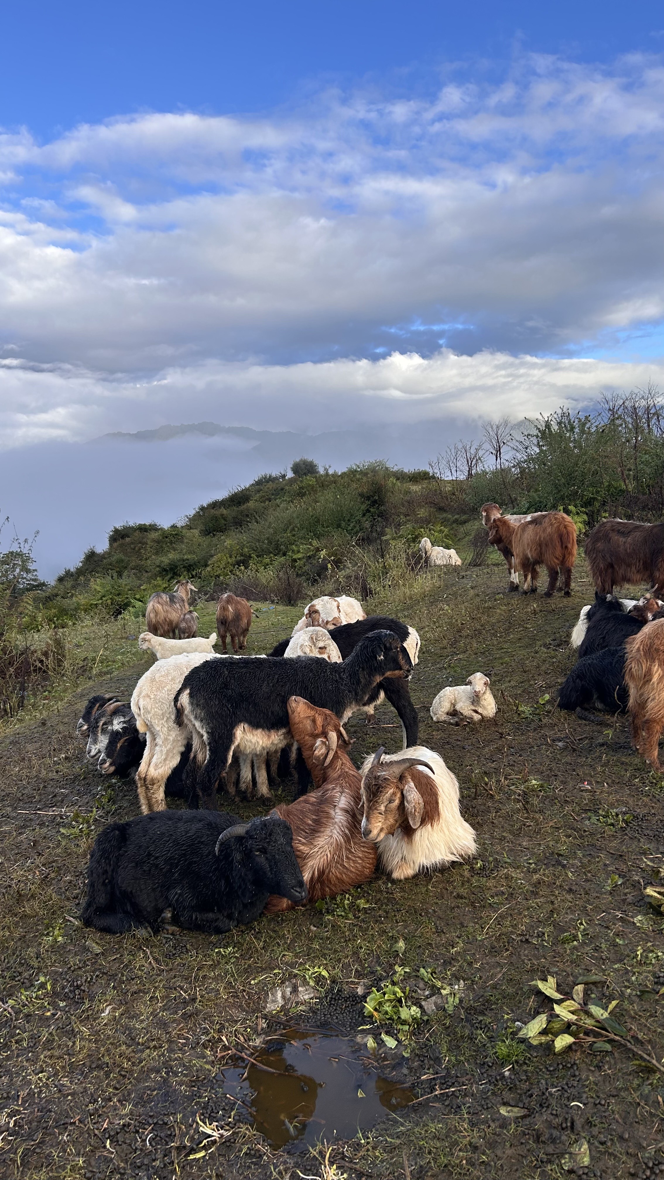 Alternative Text: A flock of goats, including various colors and sizes, is resting on a grassy slope. Some goats are lying down, while others are standing and grazing