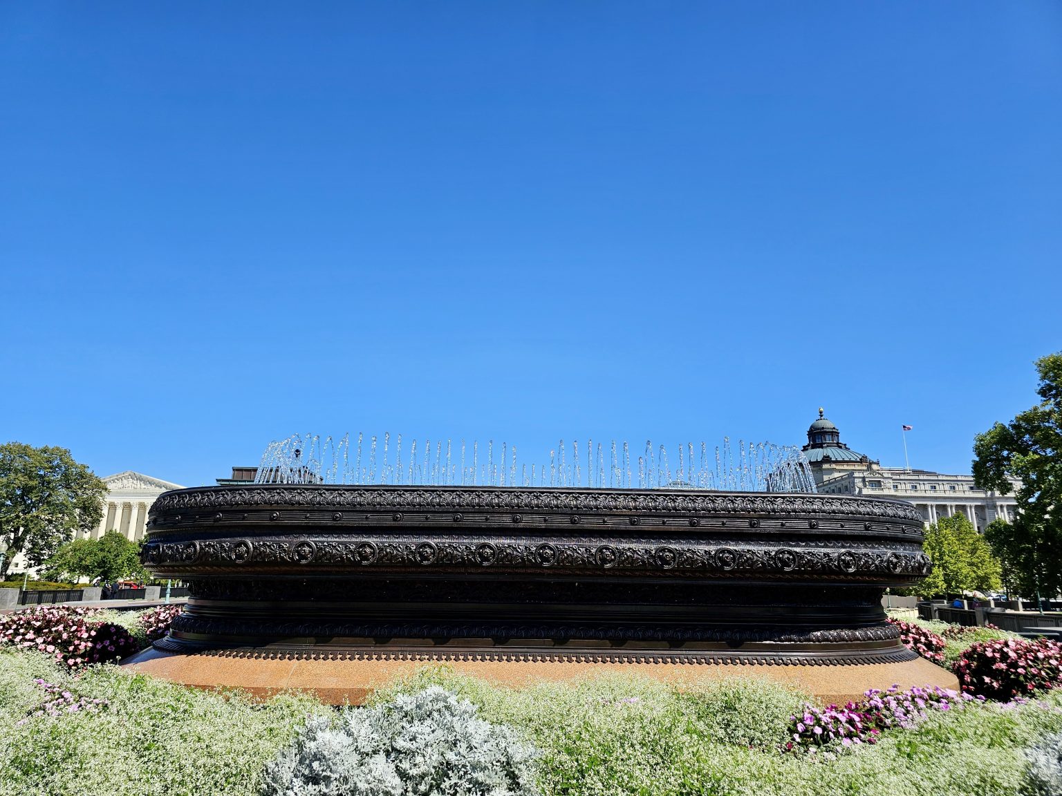 Alternative Text: A wide ornamental fountain with intricate carvings, surrounded by blooming flowers and historic architecture under a clear blue sky. Captured at Washington, D.C., United States.