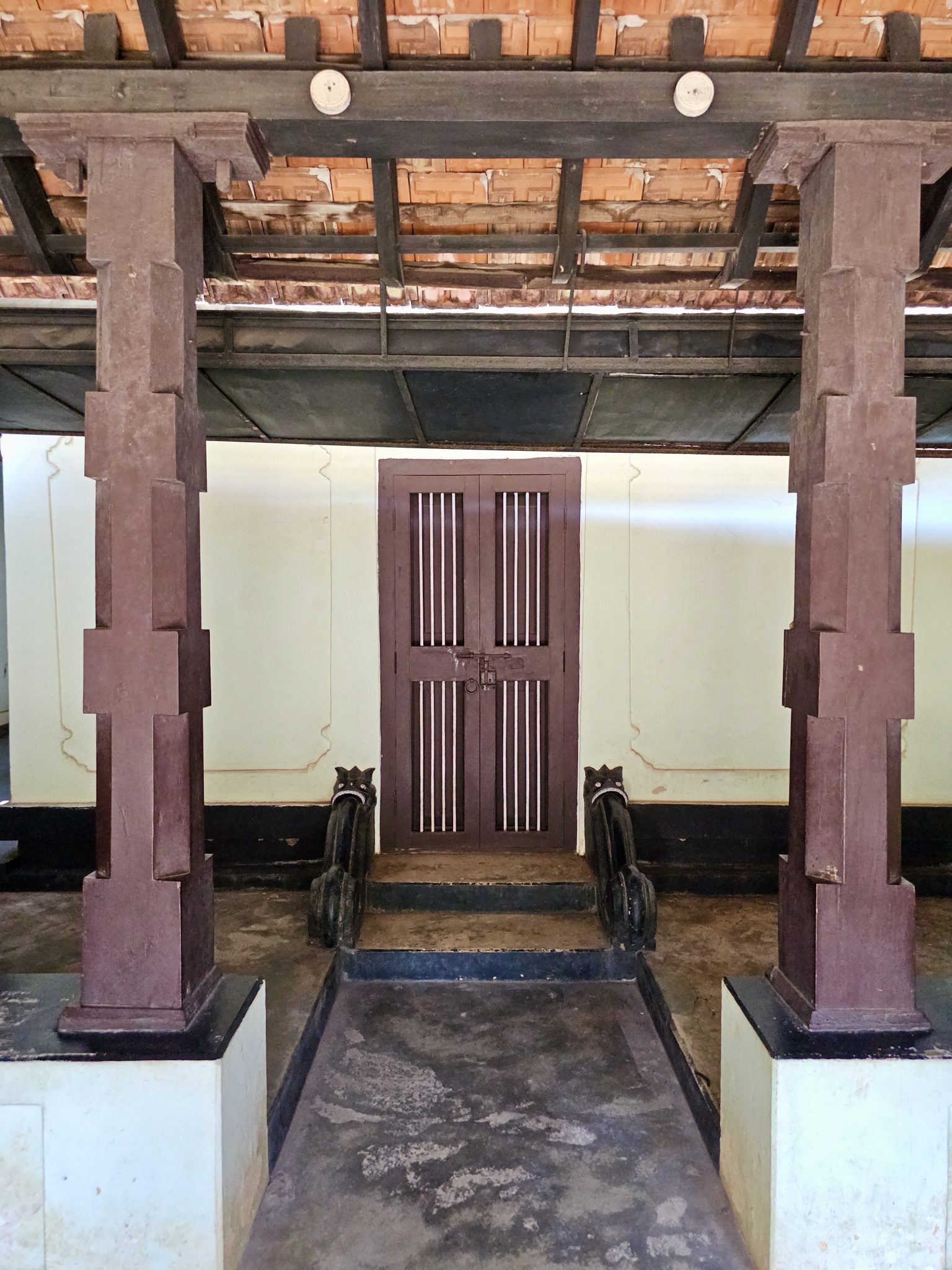 Alternative Text: A front view of a heritage entrance inside Hill Palace, with twin wooden pillars and a closed wooden door, set under a traditional tiled roof. Photo taken at Hill Palace, Thrippunithura, Kerala.