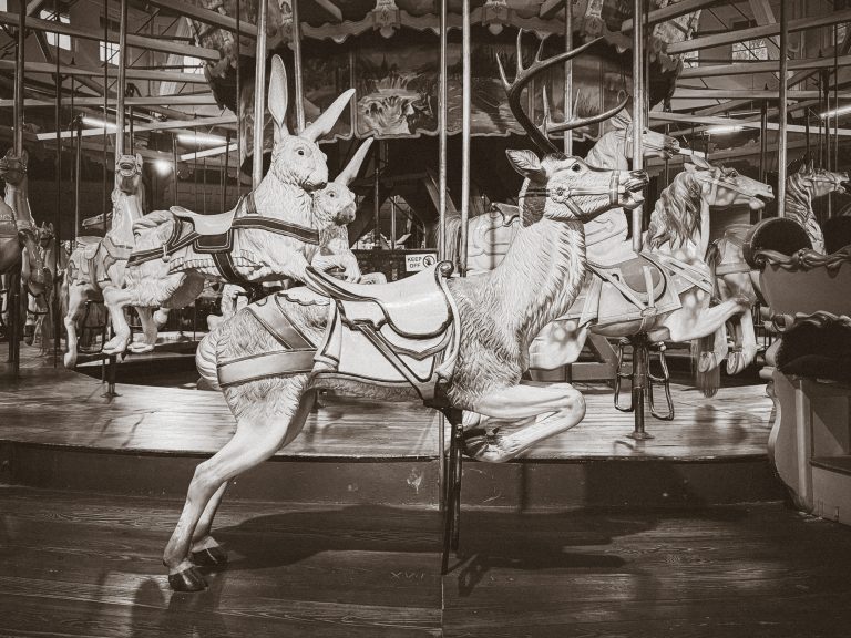 Alternative Text: An antique carousel featuring a ride-on wooden reindeer.