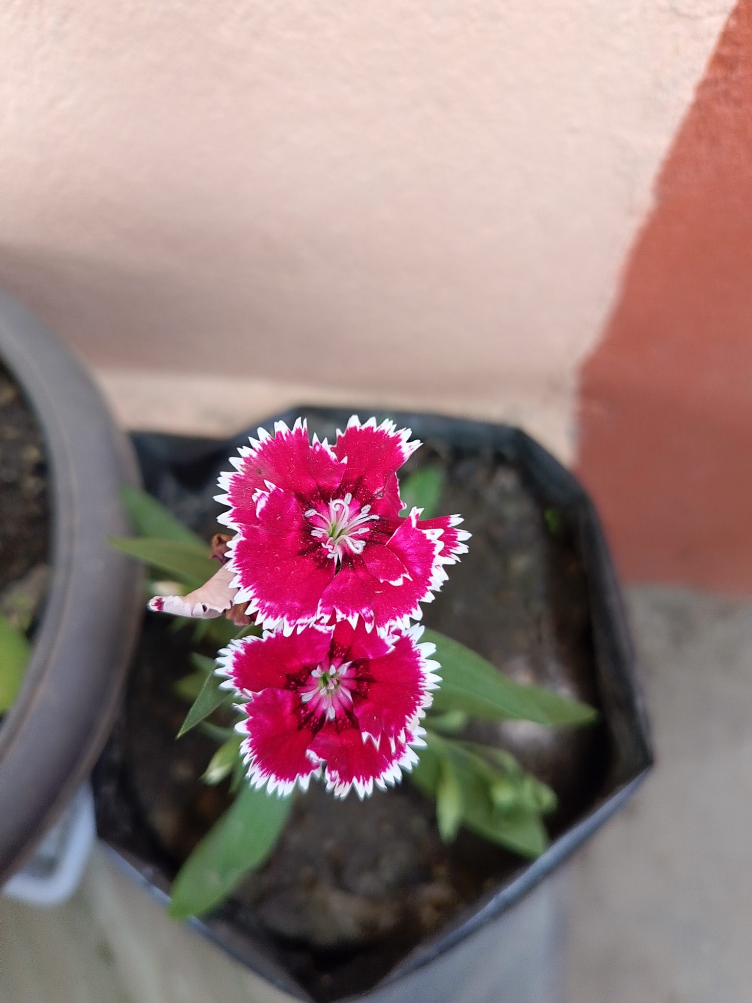 Alternative Text: A close-up view of vibrant pink flowers with white fringed edges, growing in a black pot.
