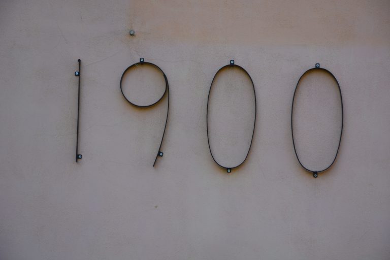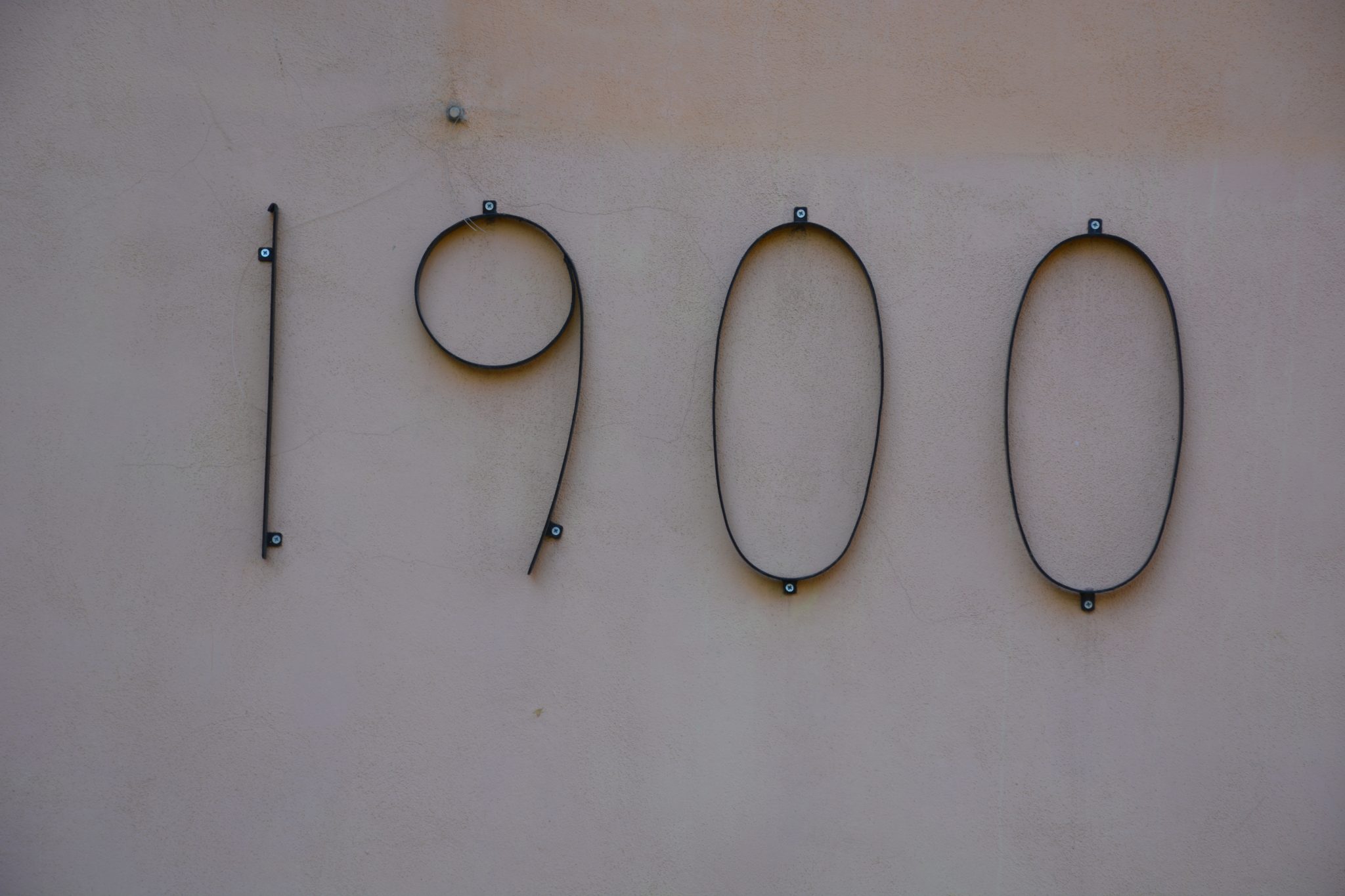 Alternative Text: Elegant wrought iron numbers ‘1900’ mounted on a pastel-colored textured wall, likely indicating the building’s construction year. Captured in Cyprus, the minimal design evokes a quiet sense of history and architectural charm.