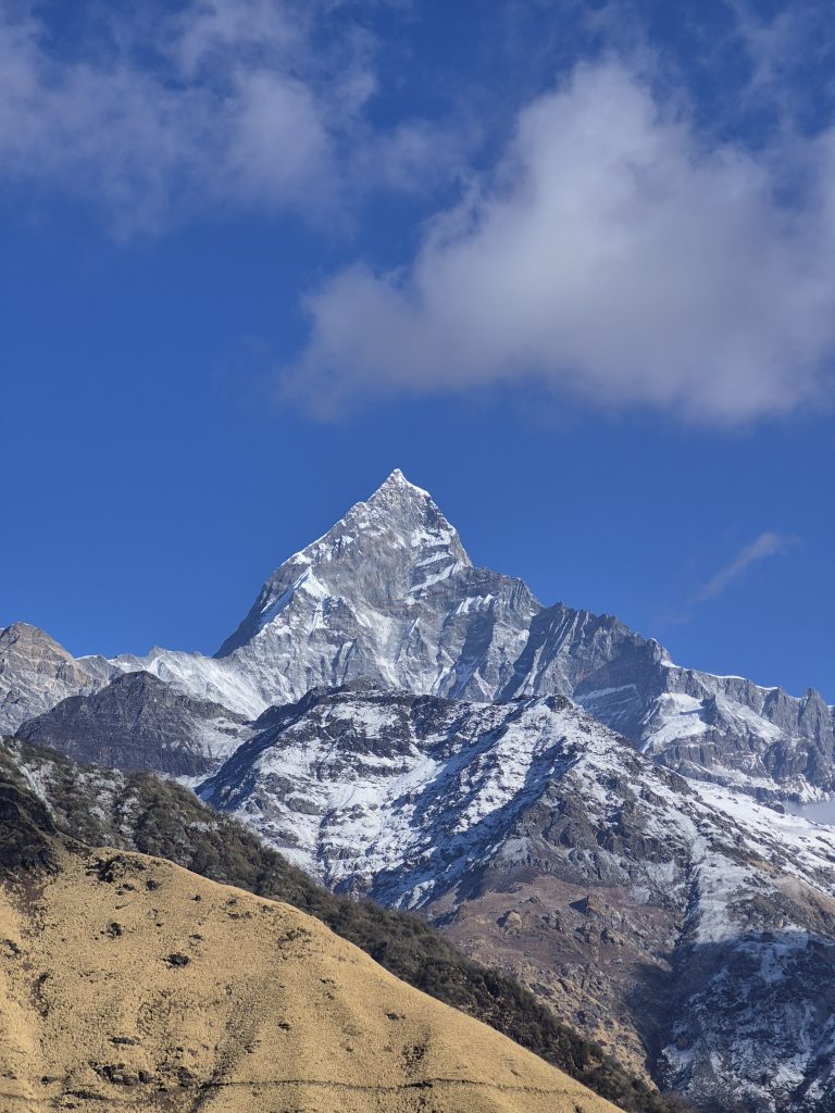 Alternative Text: A snow-capped mountain fishtail peak rises sharply against a clear blue sky, with a few fluffy white clouds scattered across the scene.