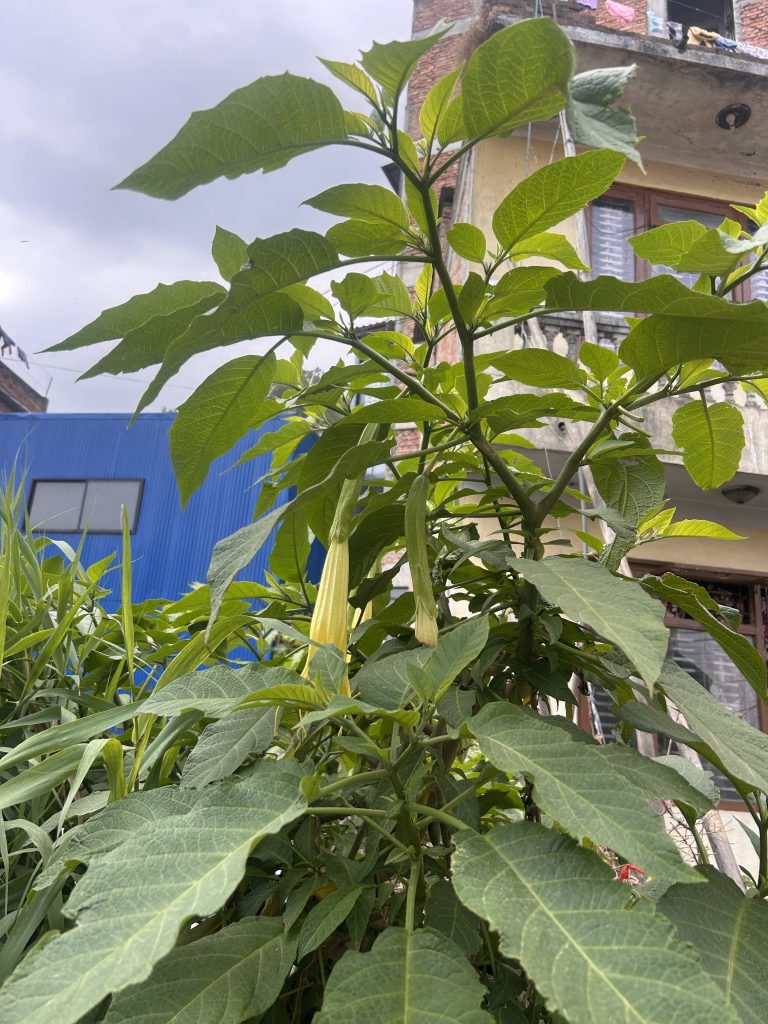 Alternative Text: A tall green plant with large leaves and several hanging yellow trumpet-shaped flowers, set against the backdrop of a blue and brick building on a cloudy day.