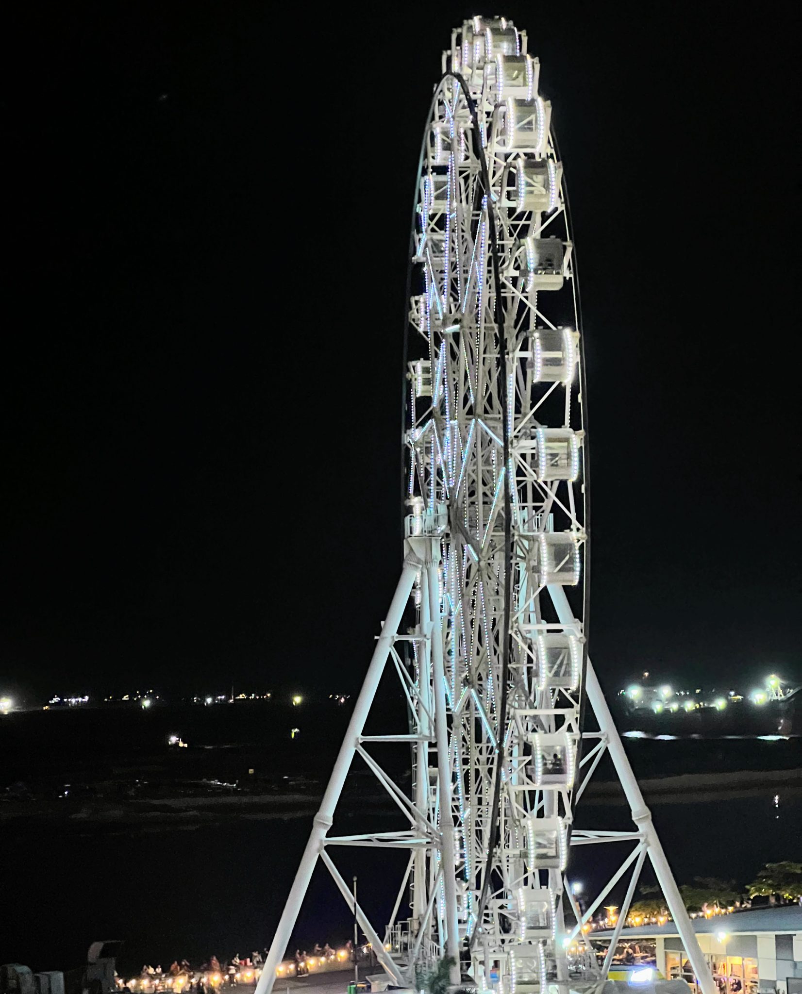Alternative Text: A tall white Ferris wheel is brightly lit against a dark night sky, with the lights of a city shoreline visible in the distance below.