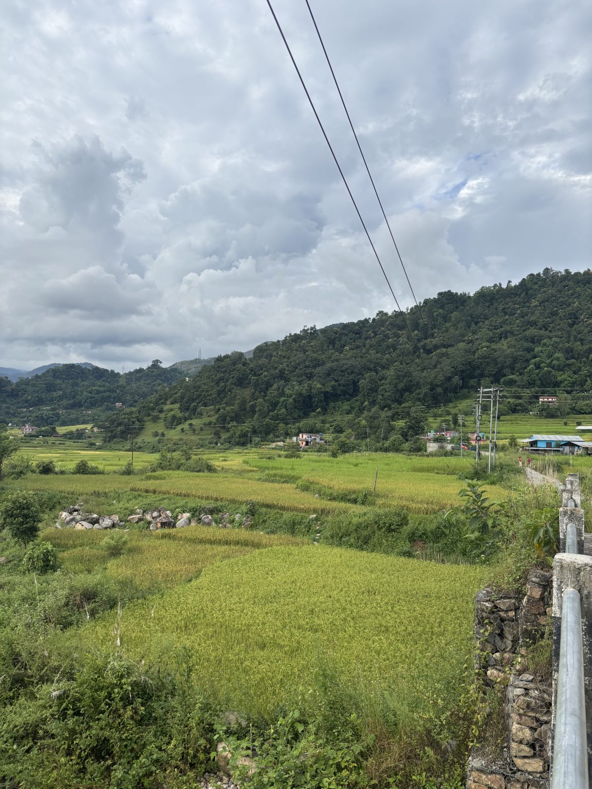 Alternative Text: Lush green rice fields under a cloudy sky, bordered by rolling hills with houses, a road, and electricity poles in the background.