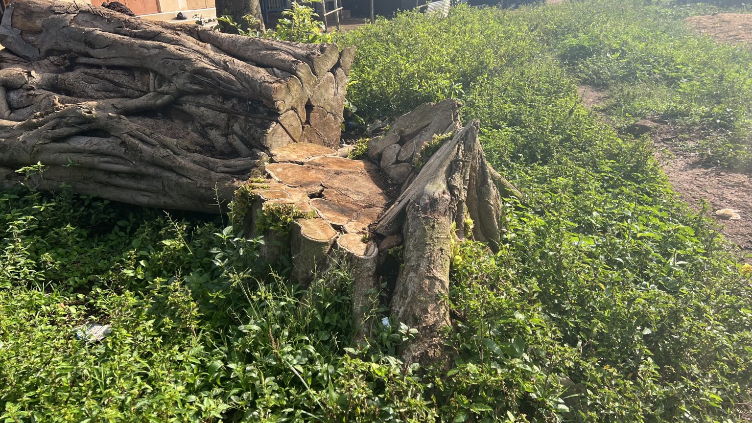 Alternative Text: A large, weathered tree stump with gnarled roots sits surrounded by lush green grass and small plants.