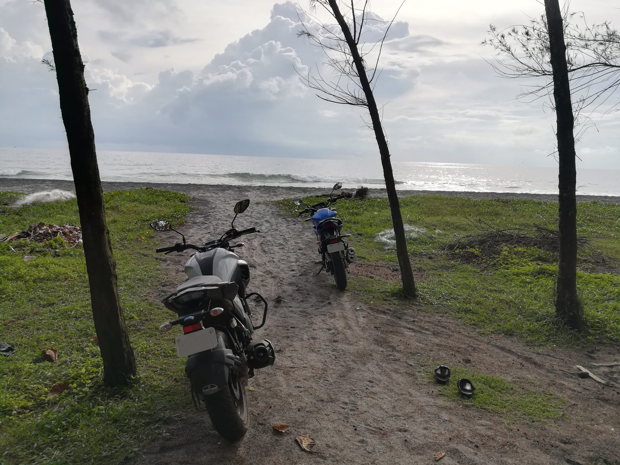 Alternative Text: Two motorcycles parked on the beach with clouds and sea in front.