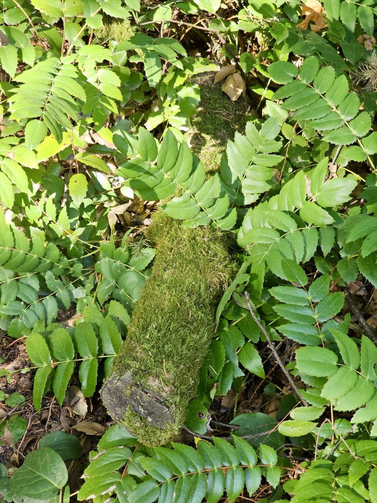 Alternative Text: A short mossy log surrounded by glossy green compound leaves on the forest floor in Hoyt Arboretum, Washington Park, Portland.