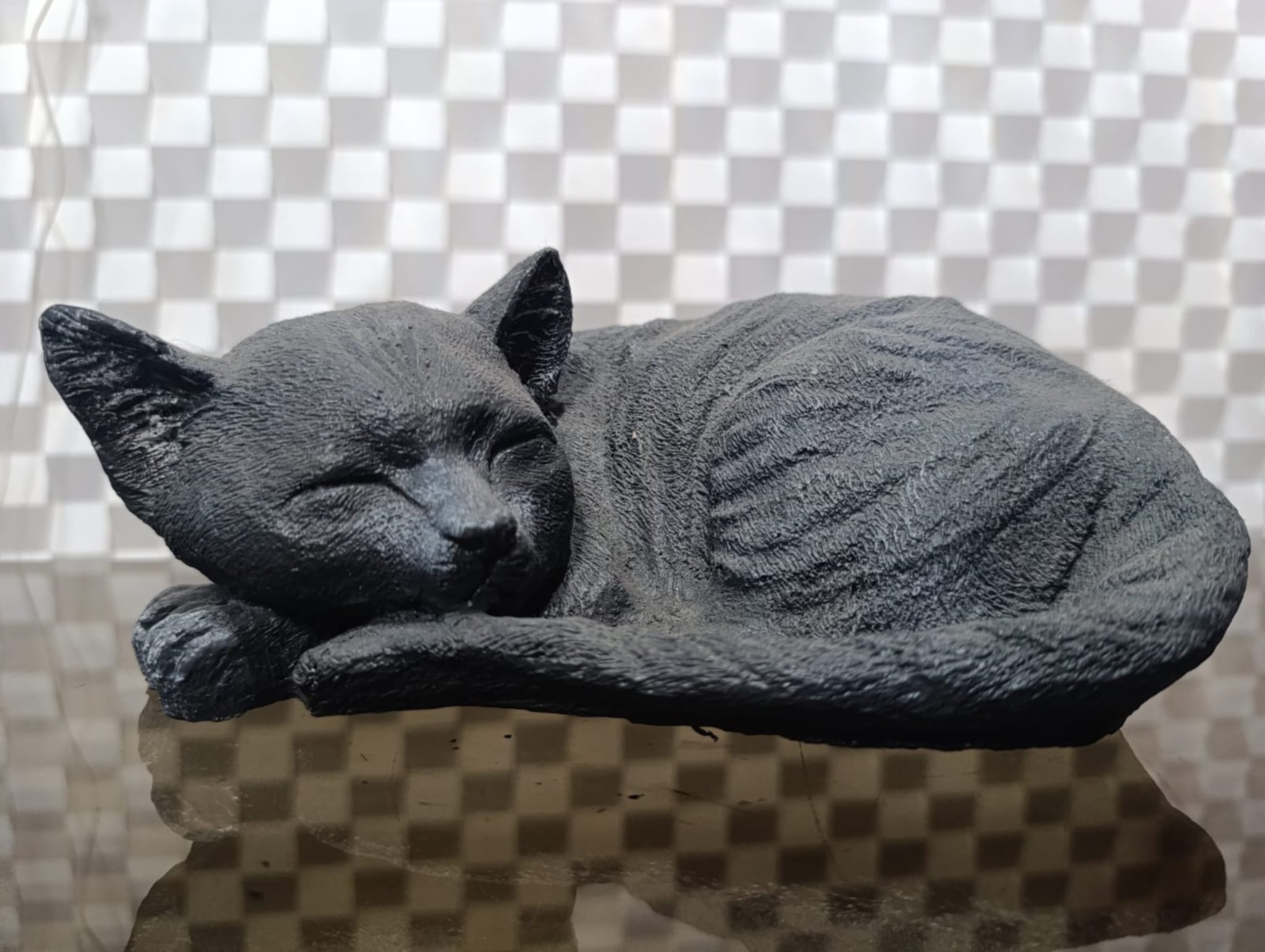 Alternative Text: A black sculpture of a sleeping cat, positioned curled up with its head resting on its forelegs.