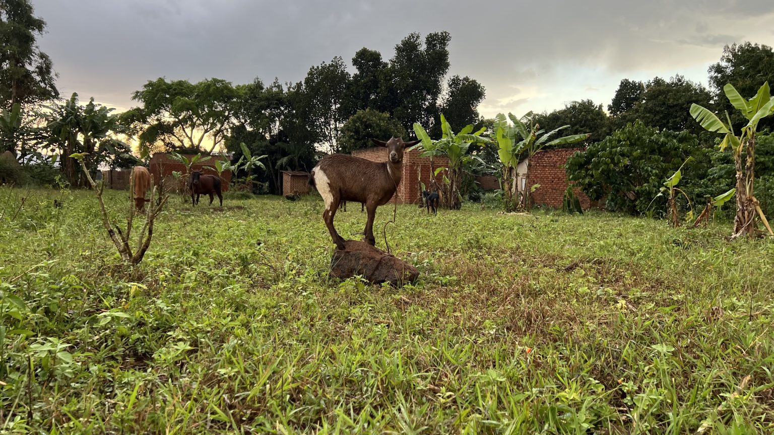 Alternative Text: A goat stands on a rock in a grassy field, surrounded by banana plants and trees.