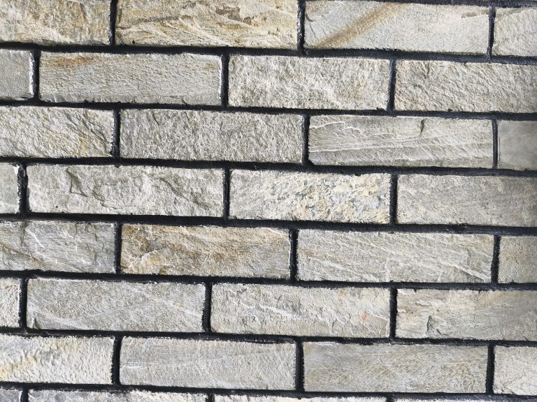 Alternative Text: A close-up view of a stone brick wall with rectangular blocks arranged in a horizontal pattern.